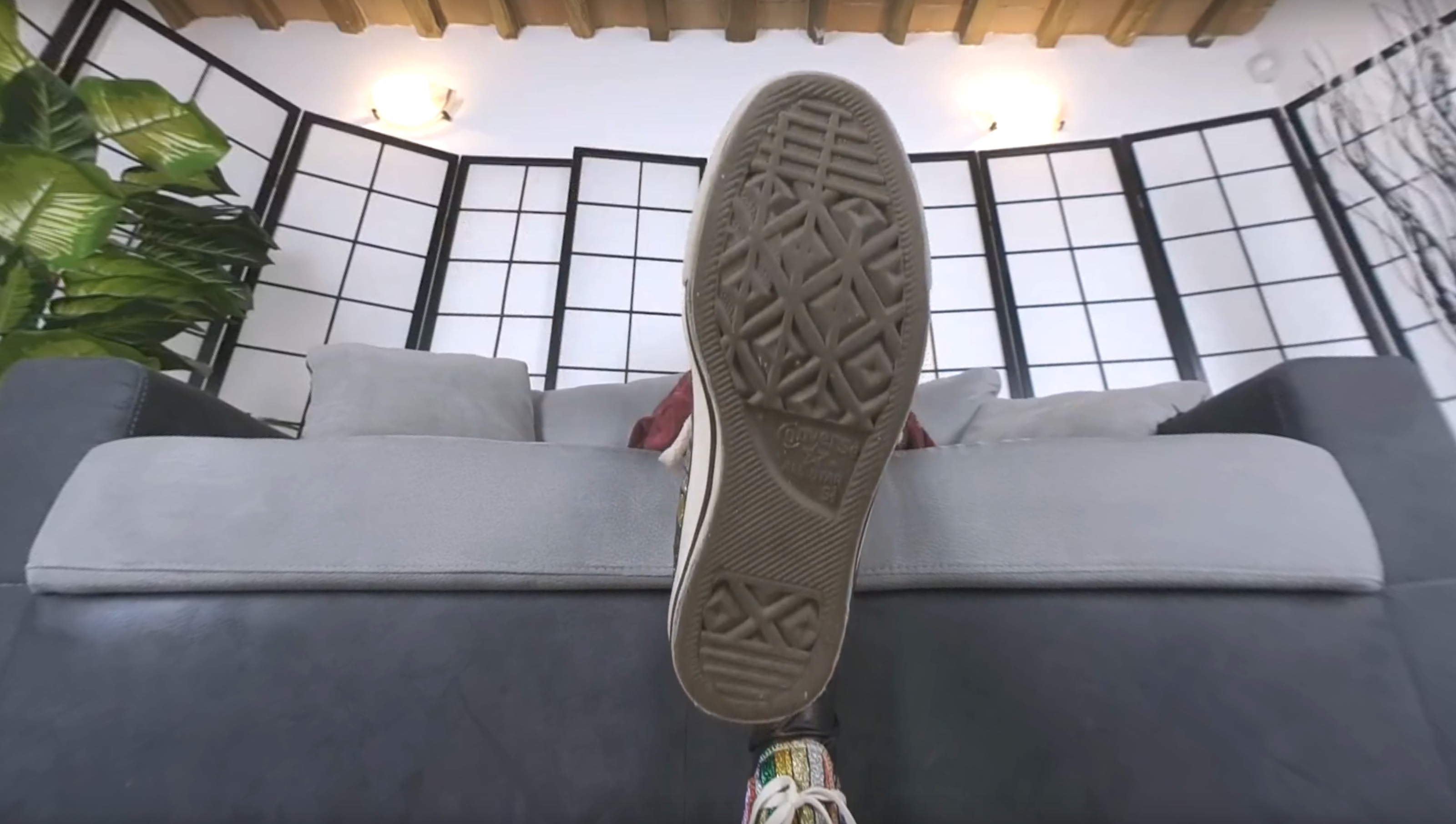 Nothing beats the comfort of loafing around and burning some time freely. Red Snow, in her red sweater and leather pants, relaxes while browsing through her smartphone. With nothing else to do, this beautiful lady chooses to make herself comfortable on the sofa. She removes her colorful rhinestone-convered Chucks, leaving only her thick grey socks. Red Snow wiggles her feet while savoring the warmth of her socks and being able to stretch her toes. The patterns on her soles are eye-catching enough that one couldn’t resist gazing at them, or at best, stripping them off and worshiping them passionately. Eventually, Red Snow slides her socks off, showing her dark-hued nail polish, long toes, and tempting arches of her feet.
