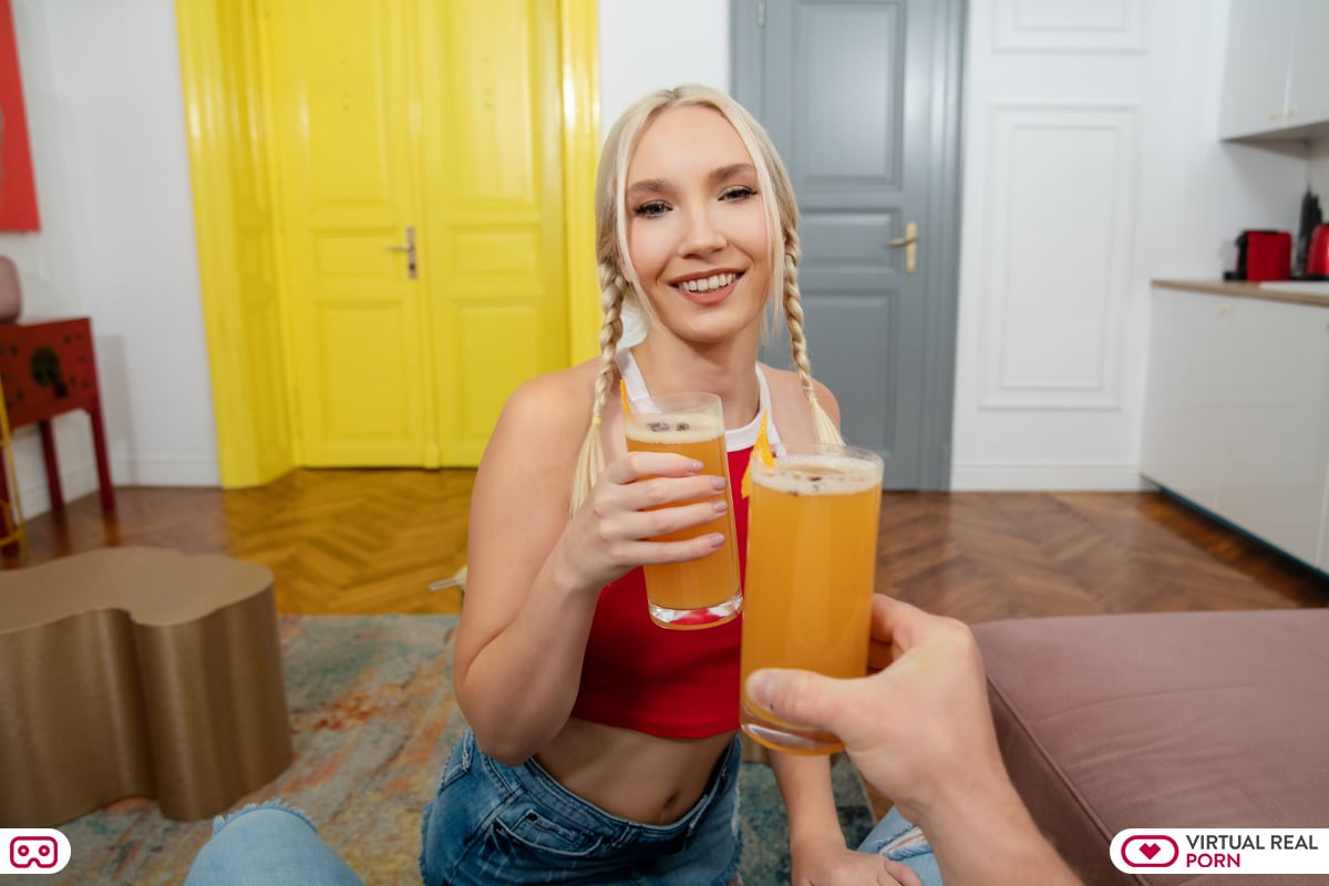 You are sitting on the sofa when Claire Roos enters the room with a tray of cocktails. She places it on the table, gracefully kneels down, and offers you a glass. You accept it, taking a sip, while she indulges in her own drink beside you. With a cheeky smile, Claire leans in and asks if you enjoy the cocktail. She gazes at you with a spicy look and mischievous grin, teasing, “Do you know what I want to do right now?”. By how she is looking at you and at your bulge, you are pretty sure of what she wants. She kneels and takes your cock to masturbate you. Then she bends her head and gives you a deep and awesome blowjob. She sits on top of you and you have sex in cowgirl position first. Her face shows how concentrate in her pleasure she is. And she wants you to have the same pleasure. She keeps fucking with you in different positions as reverse cowgirl, doggy or missionary, where you grab her butt and her boobs. In missionary-style, at the end, you take your your dick and jerk off watching her to cum over her stomach.