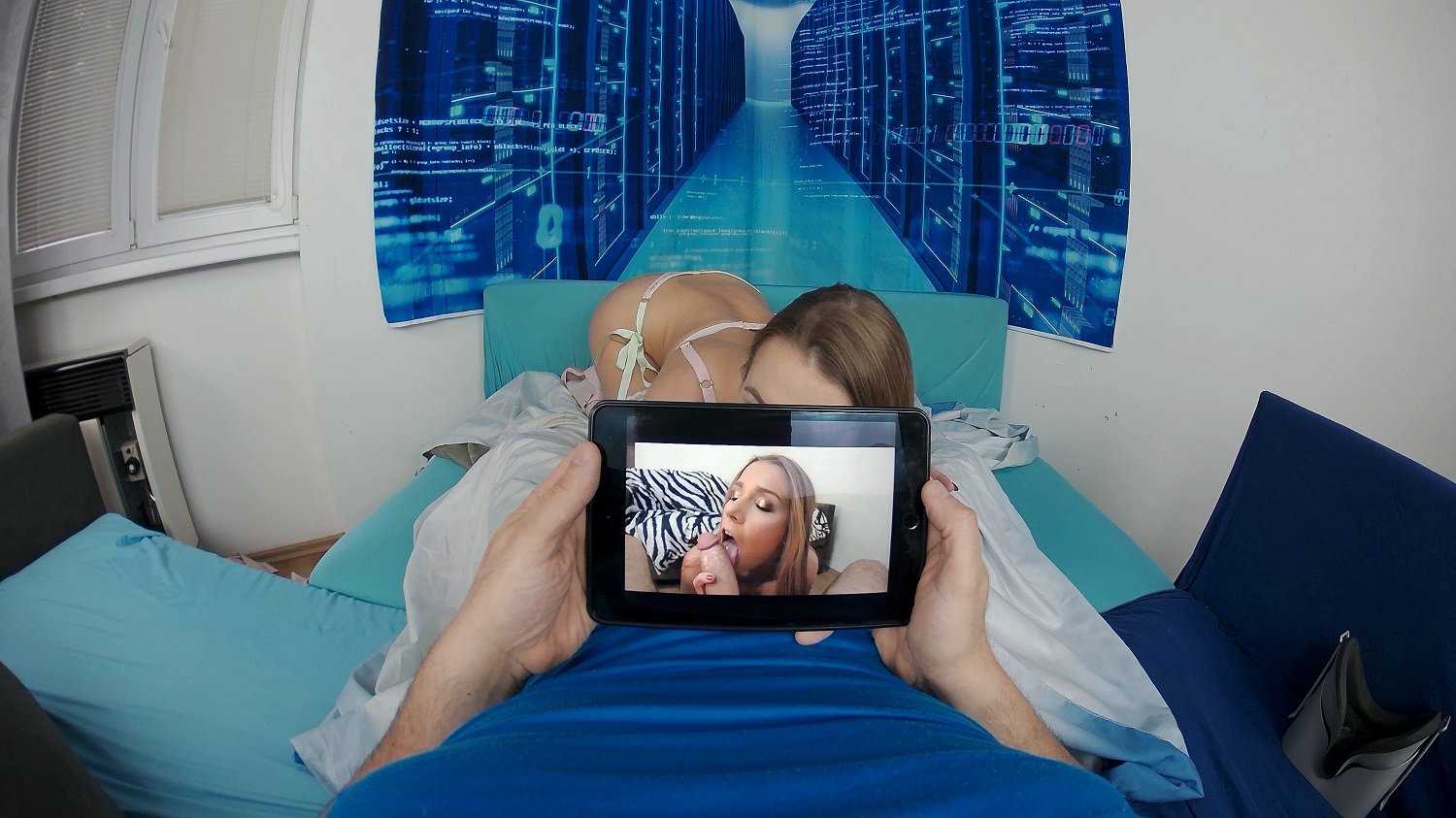 You are lying in bed, watching videos of your favorite pornstar, Alexis Crystal. Suddenly, Alexis appears on your bed, looking through a VR headset. Seems she’s found a way to join you in the VR world. After joining you to watch some clips of her previous sex romps with you, she starts getting aroused. Now, she wants to shoot a new scene. Before you know it, she slips out of her bathrobe to reveal some sexy lingerie. Then she sucks and fucks you until you spurt your virtual-reality cum into her virtual-reality mouth.