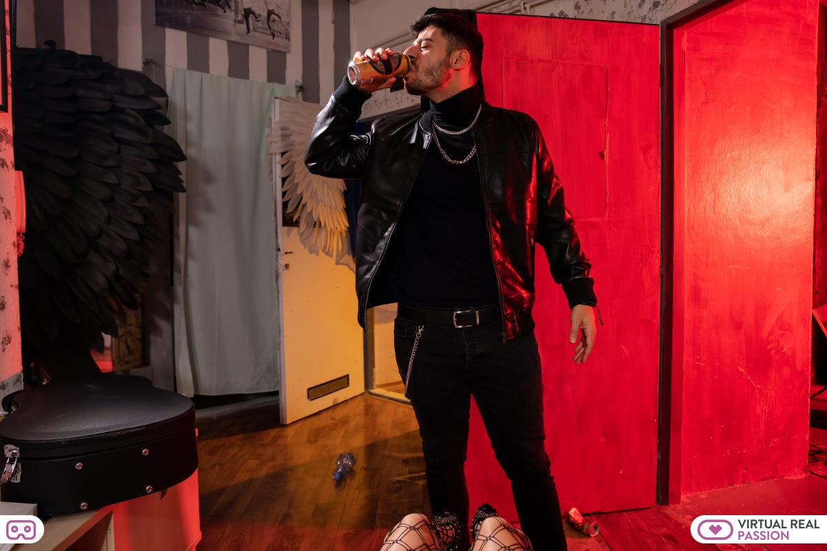 Dave Candle comes in the backstage pissed off because he doesn’t know if he can play under these circumstances: there is a disaster on the stage. At the same time that he is complaining, you can only think that he is very sexy wearing black and that he looks at you with desire. Lust and passion are in his looks, in his eyes in his whole body. Would you like to “rock and roll” with him? Both of you starts to undress while you caress each other. He takes off your panties and underwear and starts to give you a pussy licking. His wet tongue on your pussy is making you feel electric pulses under your skin. You take his hard dick and masturbate him. Right after that, he sticks his cock in you and you have sex in missionary. You change positions and you take the lead, in cowgirl you fuck him nicely. Both are having so much pleasure there in the backstage!