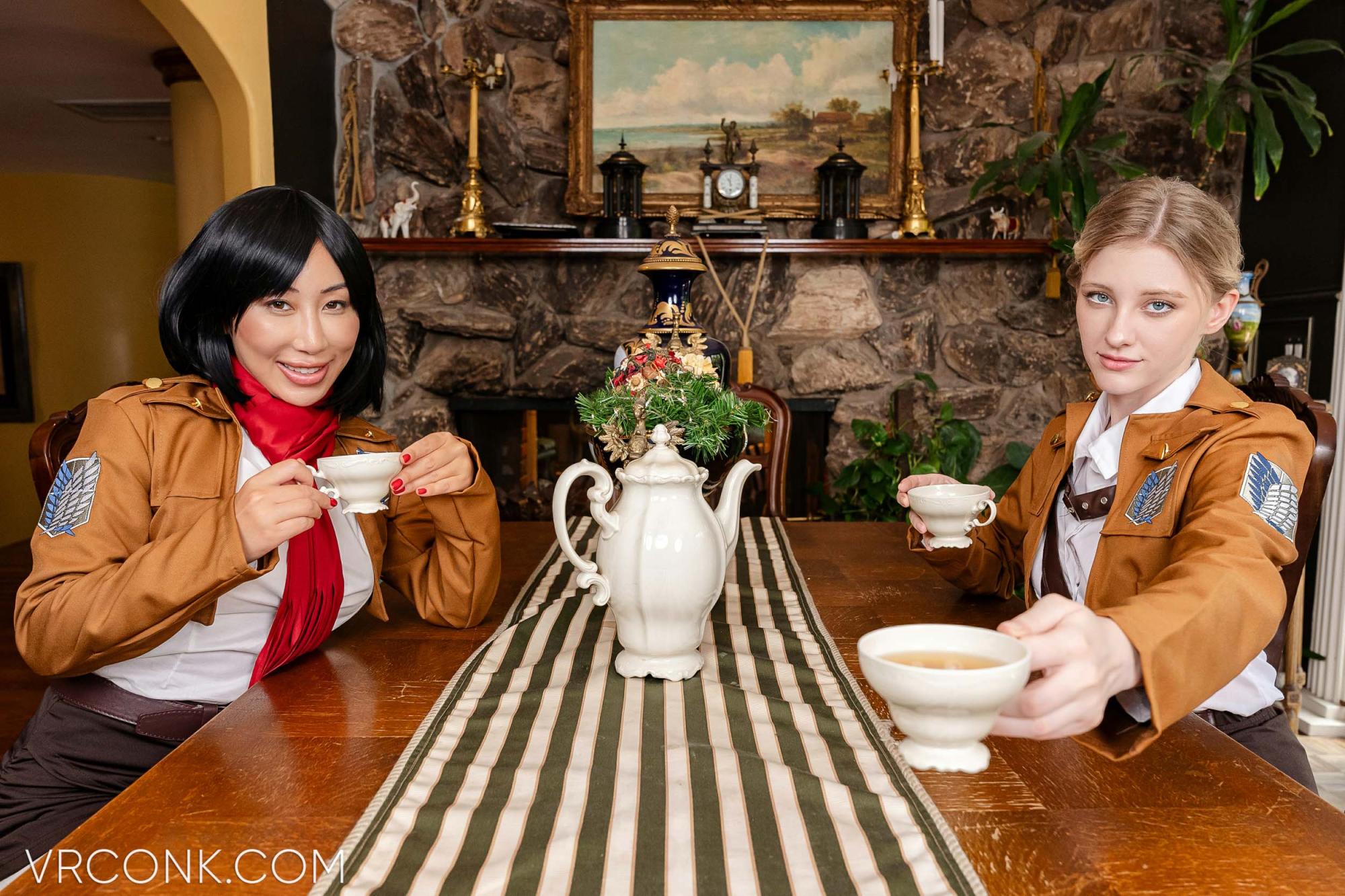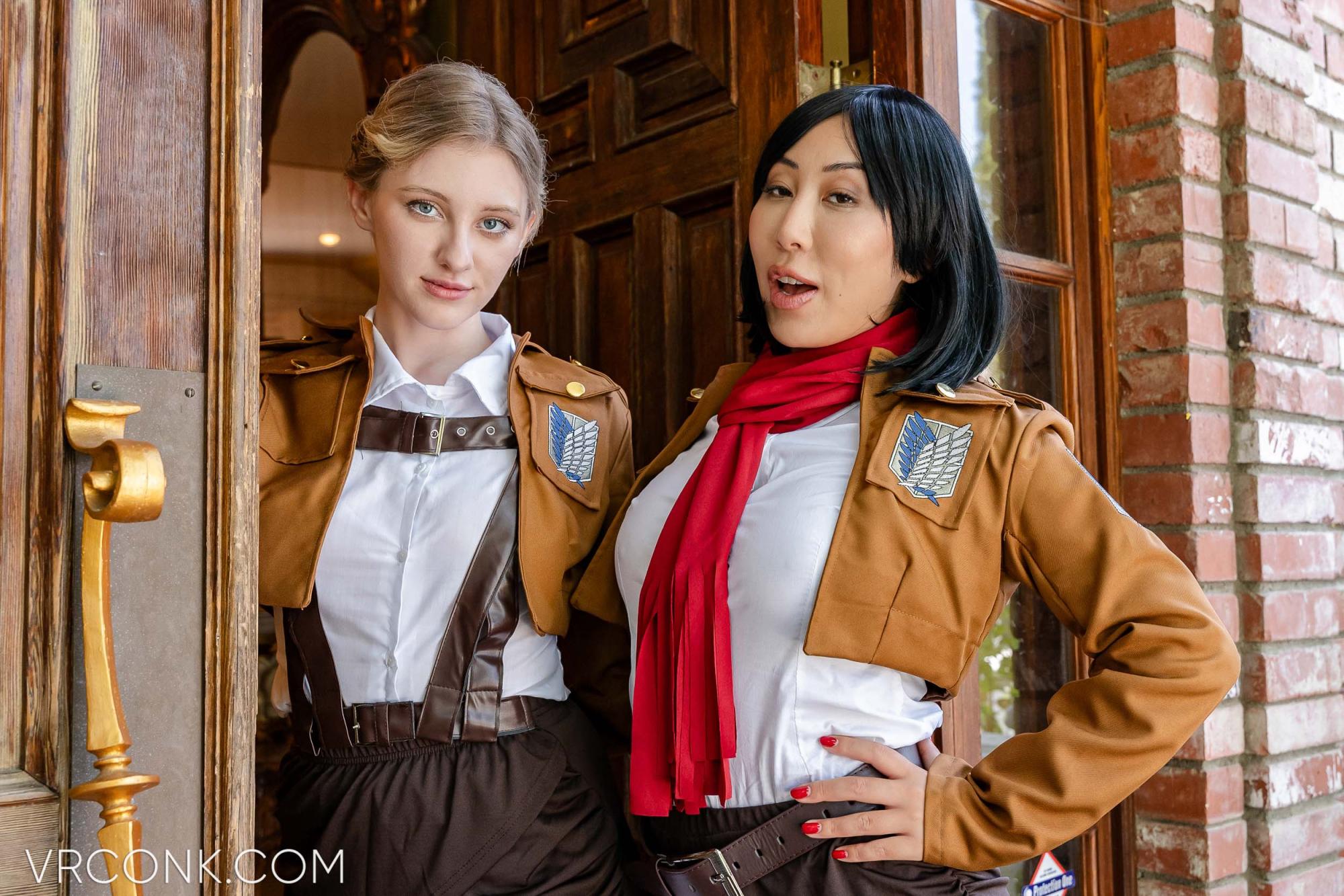 It's been a while since we introduced an anime VR porn cosplay video from an entirely new franchise—don't you think? That's why we've lately been looking for a fitting candidate for the spot at VR Conk—and while we had so many options to choose from, we ended up producing a release based on Attack on Titan! What do you think about this anime? Do you like it? Did you watch it? Regardless of your answers, it's coming in its parody VR porn cosplay version—so you better brace yourself! Welcome to Attack on Titan: Mikasa Ackerman & Historia Reiss (A Porn Parody)—VR Conk's latest VR cosplay porn movie with not one but two super-hot pornmodels as heroines from this hit horror fantasy series. Inside it, you're about to join a reunion of three iconic characters from the show—its main protagonist, Eren Jaeger, his adopted sister, Mikasa Ackerman, and the last living descendant of the royal family, Historia Reiss. Our version of the story happens after the ending of the original one, and its focal part will guide you directly to Historia's luxurious bedroom. Long story short, your reunion with the ladies is all about appreciating the fact you've managed to survive all those attacks of the Titans, which leads into a one-of-a-kind threesome VR porn cosplay scene that you won't easily forget. Oh, and we almost forgot to tell you who's playing the roles of the girls on behalf of this VR cosplay porn fantasy. And since we're talking about Melody Marks VR porn star and Nicole Doshi VR porn model—which belong to the most recognizable names of the entire cosplay VR porn industry—you'll surely appreciate our choice of the cast. After all, you wouldn't say 'no' to such hotties in their slutty costumes and dressed as your favorite anime characters of all time—would you?