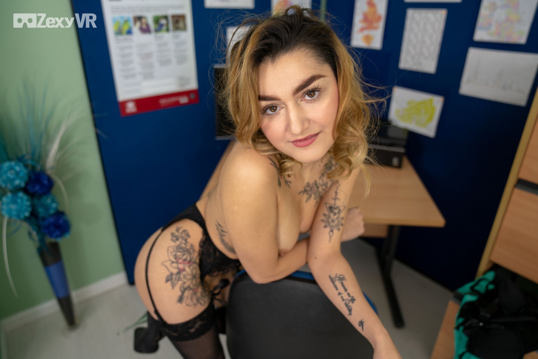 Gorgeous babe Callie T is super bored at work today and needs someone to entertain her... And she's picked you out of everyone in the office! Watch this stunning babe strip off out of her office uniform and reveal her slender tatted body and incredible bust!