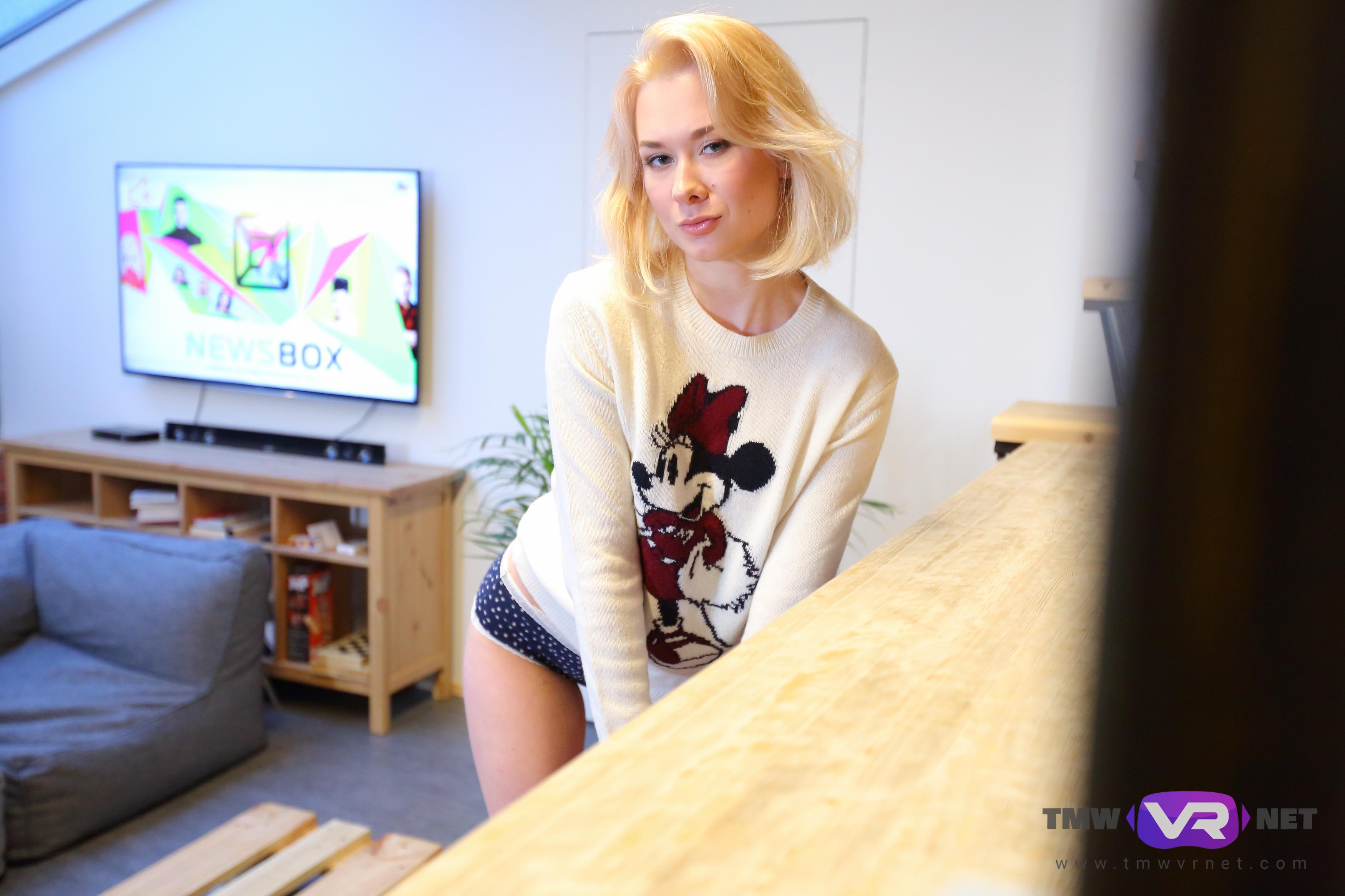 Sweet blondie loves spending time all alone at home because she can wear only panties and tight sweater. When she gets too hot, she can simply undress to cool down or maybe that makes her feel even hotter. Anyway, she pulls up her sweater, rubs pussy through panties and, when she needs something spicier, moves on to further actions.