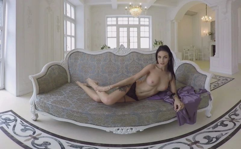 It’s early in the morning when this brunette hottie comes into the living room still wearing her robe. She sits down on the couch to relax a little, her head still swimming with the sex dreams she had last night so she opens the robe up and starts running her hands all over her fit, incredible body. Standing up on the couch, she drops the robe and feels her big, perky tits then she lays back down on the couch and slides her hand between her legs, feeling her very soft pussy through her lacy panties. This babe gets her day started in a very erotic way.