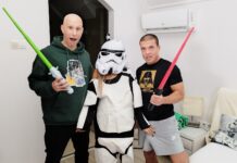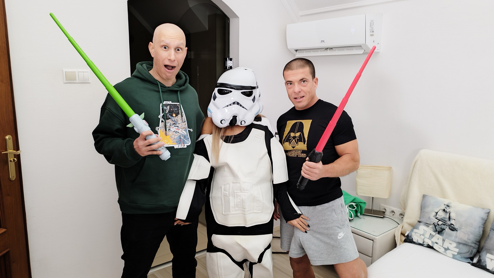 The first of two parts is in 180 degrees virtual reality (VR) with one of the hottest women in porn, Chloe Temple. Filmed from a voyeur, aka behind-the-scenes (BTS) viewpoint, you will feel like you are part of the action. Cheating blonde Chloe Temple decides to get even with her loser boy friend, Porno Dan, by having a threesome with his best friends, Brad Knight, and Matt Bird. Hapless Dan is dressed in his Boba Fett outfit and has to film his buddies banging his girl. Chloe Temple throws down the nerds and rips open their pants. Then the thirsty blonde pulls out their big dicks and takes turns giving them a sloppy blowjob. Chloe Temple decides to ride the huge cock of Matt Bird first while she gets face fucked by Brad Knight. Horny Chloe Temple loves it when Brad Knight gives her a hardcore hammering and begs him to slap her ass. The bubble butt baddie loves being spit roasted by the monster cock buddies, and the harder they pound her hairy pussy, the more she cums. Matt shoots a huge cumshot on the big booty for the finale. Keep your headset on as Chloe gets even more diabolical in part two!