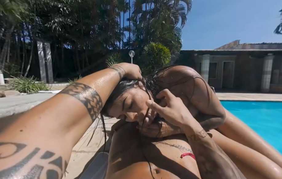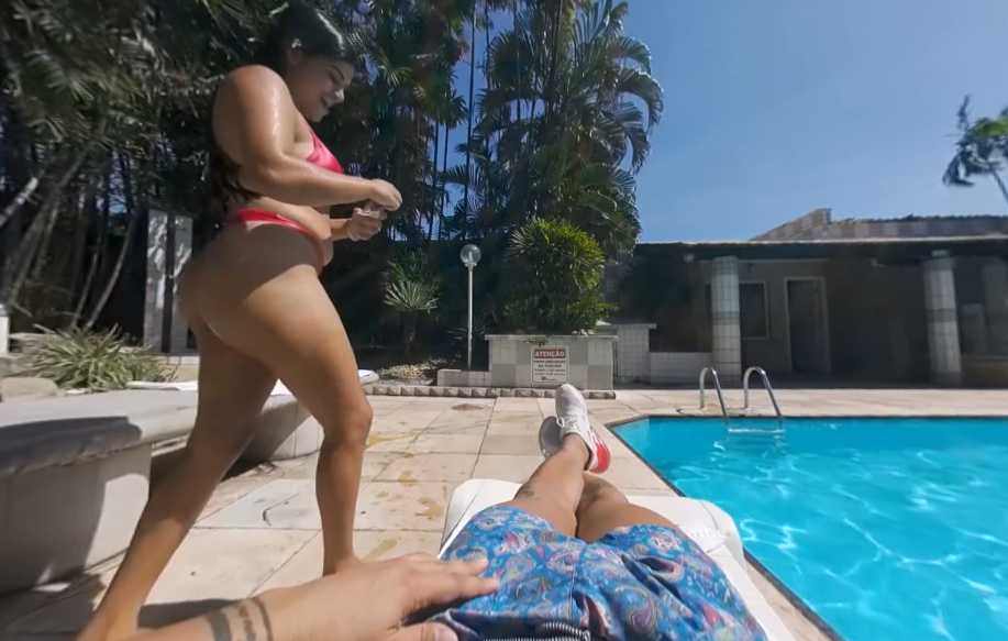 Laying by the pool grabbing some sun, this guy is just chilling, and then that’s when Maria shows up and shows off her hot body dressed in a skimpy bikini. When she reveals her nice scrumptious tits, he has no choice but to grab his own cock and wish it were inside her. Maria gets up and jumps in the pool and swims around just to tantalize him. She gets out, walks over to him laughing because she knows he’ll do whatever she wants. She rubs lotion on his body, he plays with her tits, she sucks on his dick and then she climbs on top so her shaved