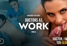 You’re immersed in your work at the desk when Maria Wars appears in the doorway. Her sultry gaze locks onto you as she softly speaks, her voice low and deliberate, calling you “Doctor” in a way that’s impossible to ignore. She steps into the room, her words teasingly referencing a past encounter. Mentioning your open relationship, she proposes revisiting your sensual experience together right now. She looks at you fixedly while she kneels on the floor and takes off your trousers. She licks your dick doing round moves with her tongue, which turns you on. Then, she sticks it inside her mouth and gives you the best blowjob of your life. After taking off her clothes, you fuck her in doggy-style and missionary against the examination table. She rides you in cowgirl and reverse cowgirl too. At the end, she masturbates you until you cum under her expert hands.