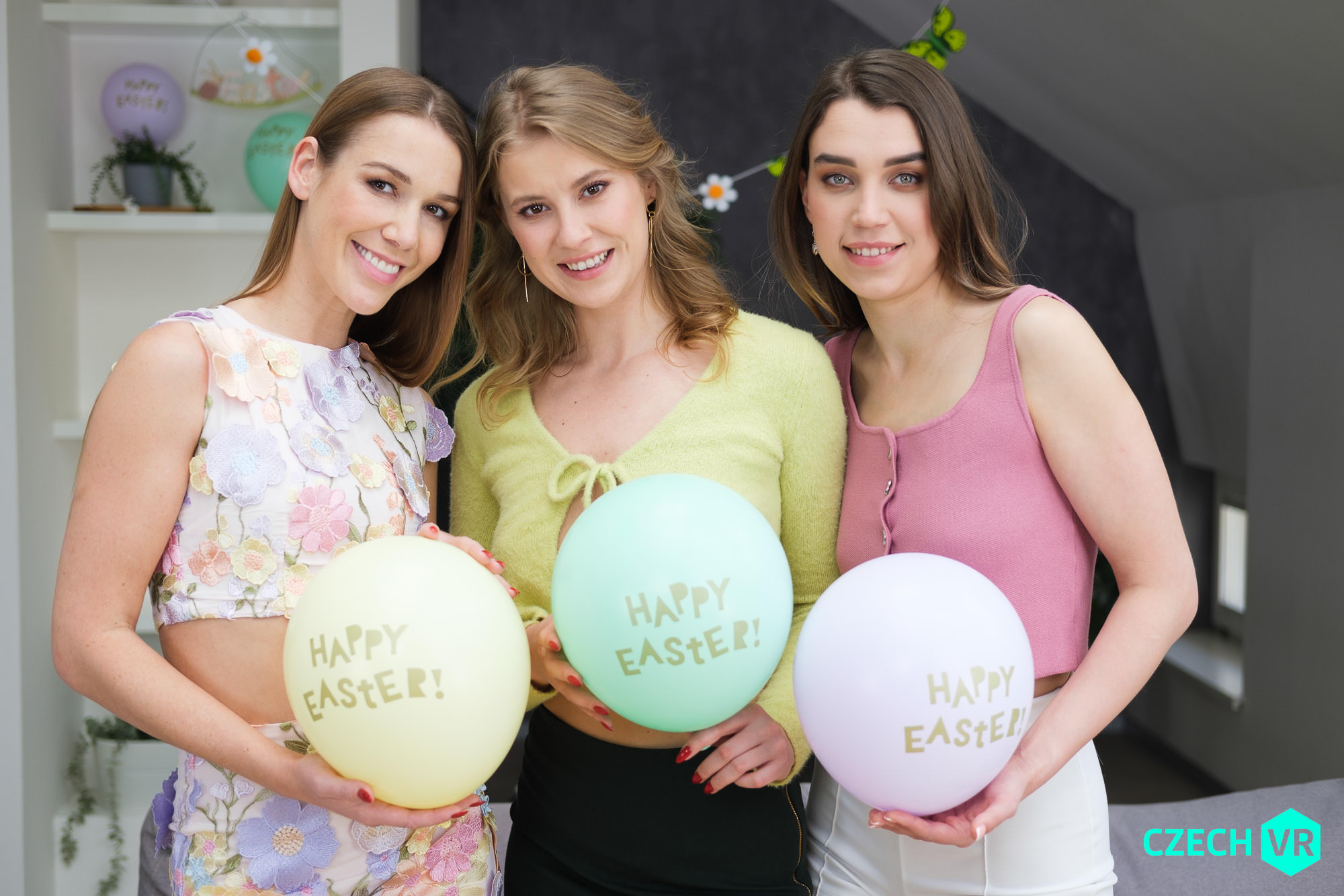 Easter is a Christian holiday of rebirth and fertility. It is also a time of traditions and houses get filled with lovely Easter decorations. Your Easter is all the more special, because you spend it with three of the hottest girls a man can dream of. When they hunt for more decorations and discover a huge rubber dildo put away from last year’s festivities, things quickly take an epic turn!