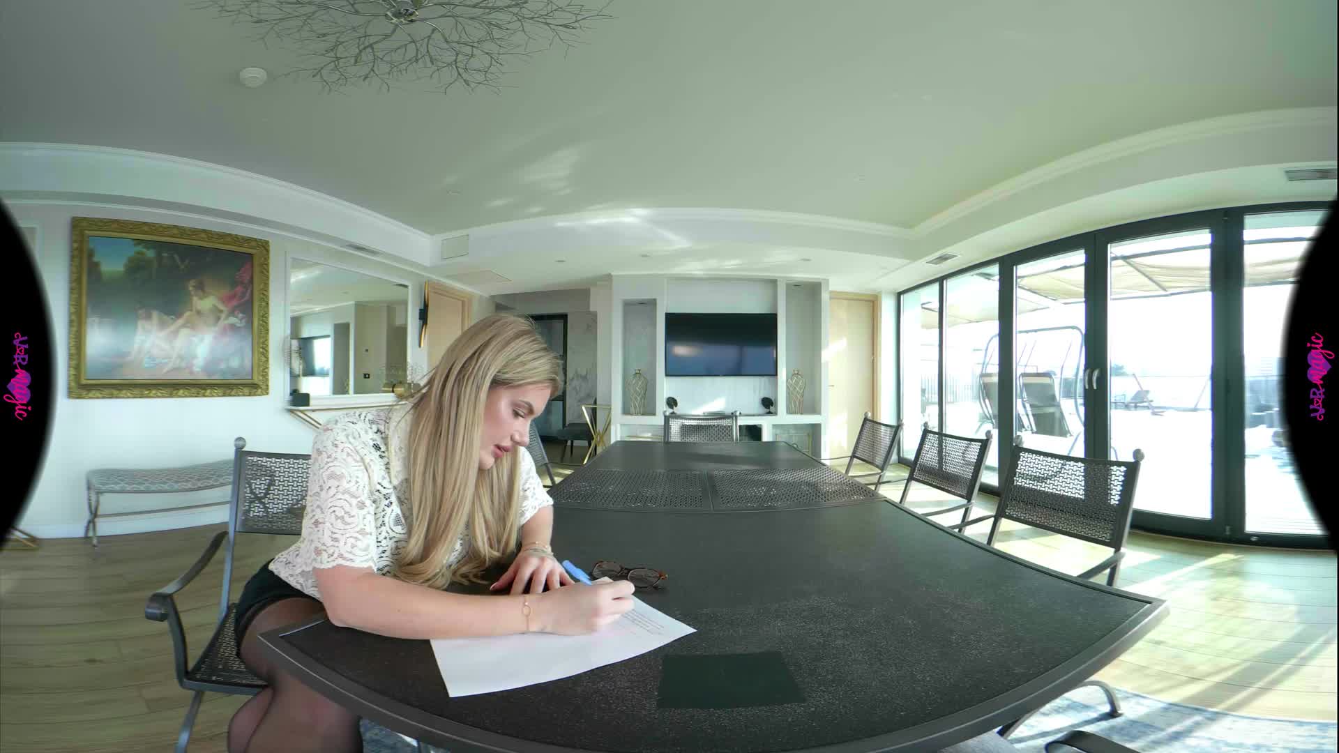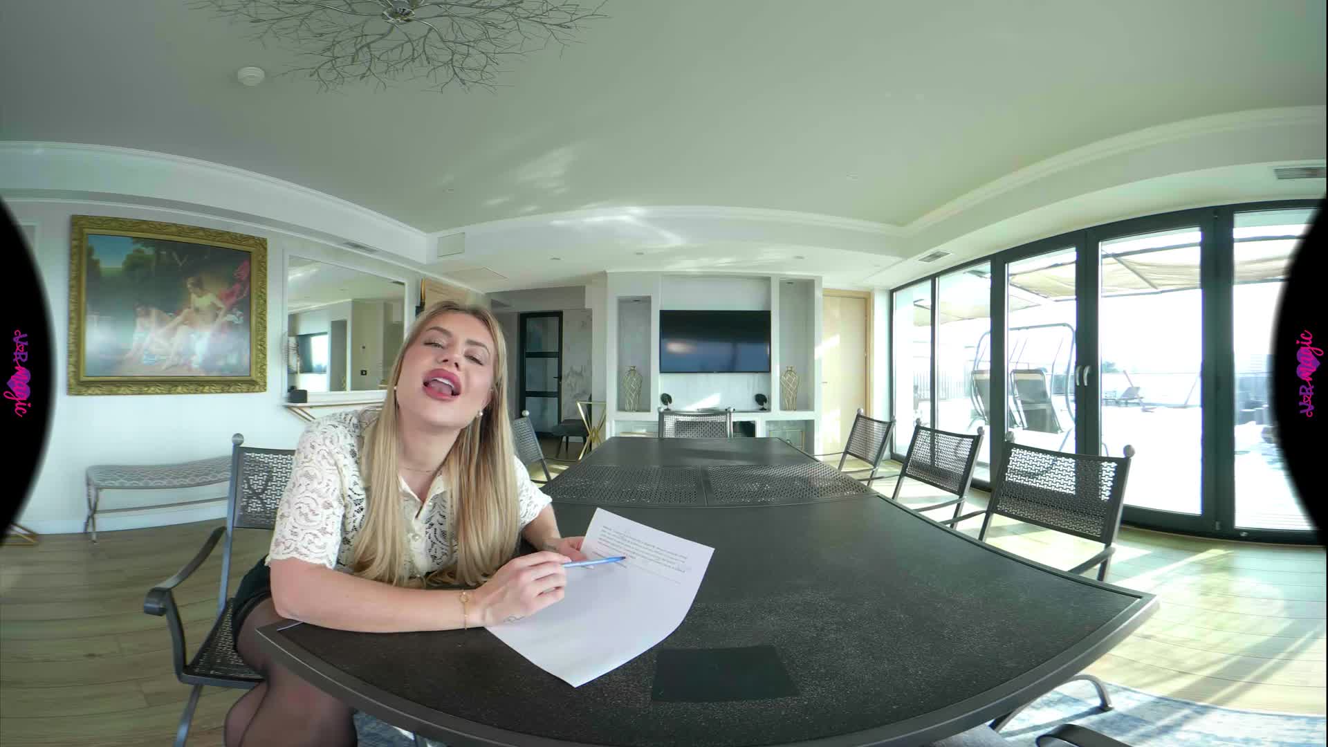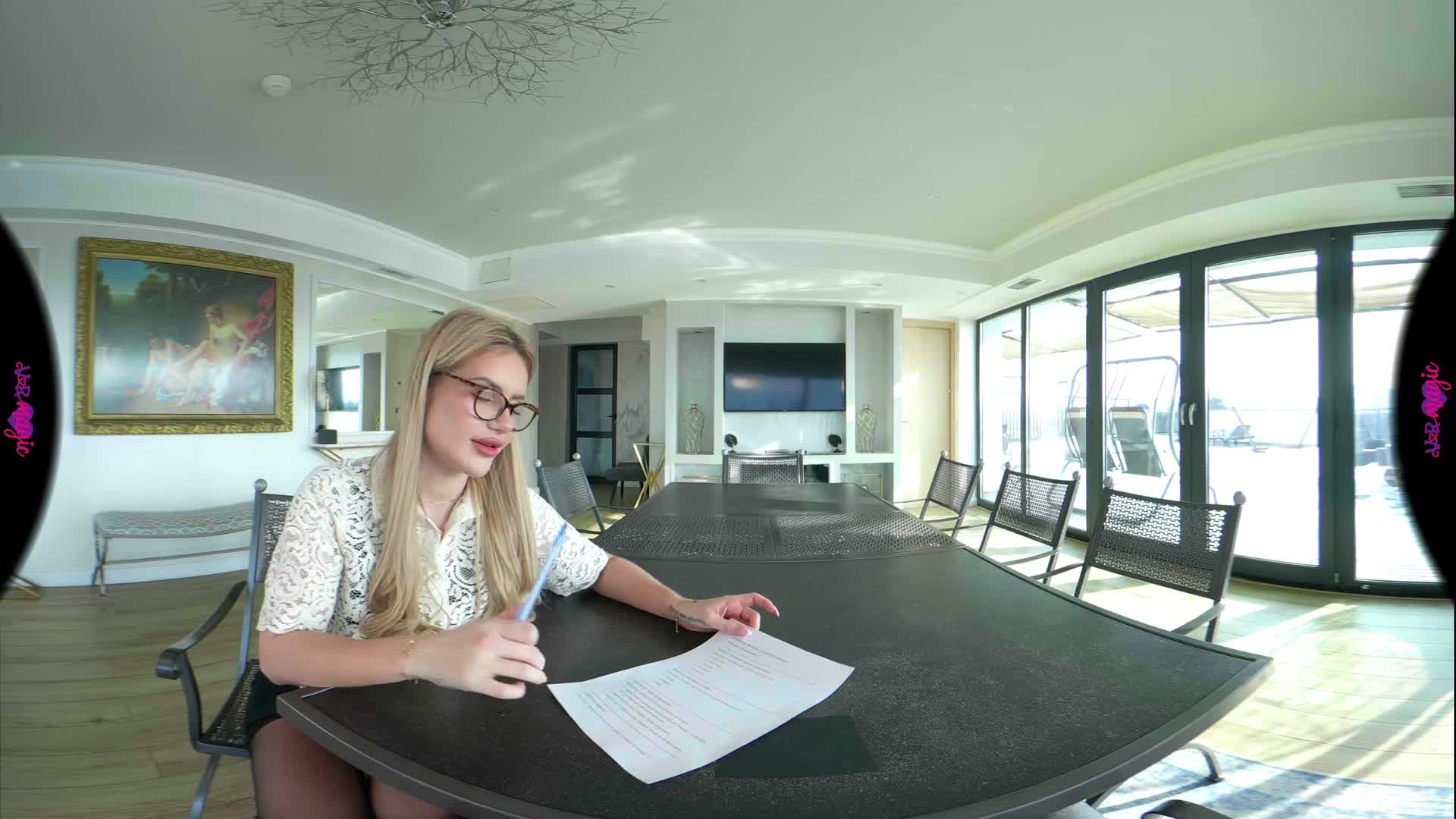 You’re sitting at the head of the table, trying to focus on your French homework, but it’s impossible. Your tutor, Georgia, is pacing around you in a tight skirt, sheer stockings, and glasses, her heels clicking against the floor. When she leans over you to correct your pronunciation, the scent of her perfume and the sight of her lace lingerie under her shirt make your heart race. She whispers that you aren't breathing properly—that you need a more "practical" demonstration. The homework is pushed aside as she slides onto the table right in front of you, slowly parting her legs. You watch, breathless, as she undresses and takes control, guiding you through a masterclass of desire. From her knees under the table to taking charge in cowgirl and doggy, every move is designed to teach you the true language of passion. By the time you're on the floor together, you realize this isn't about grammar anymore—it's the best lesson you've ever had.