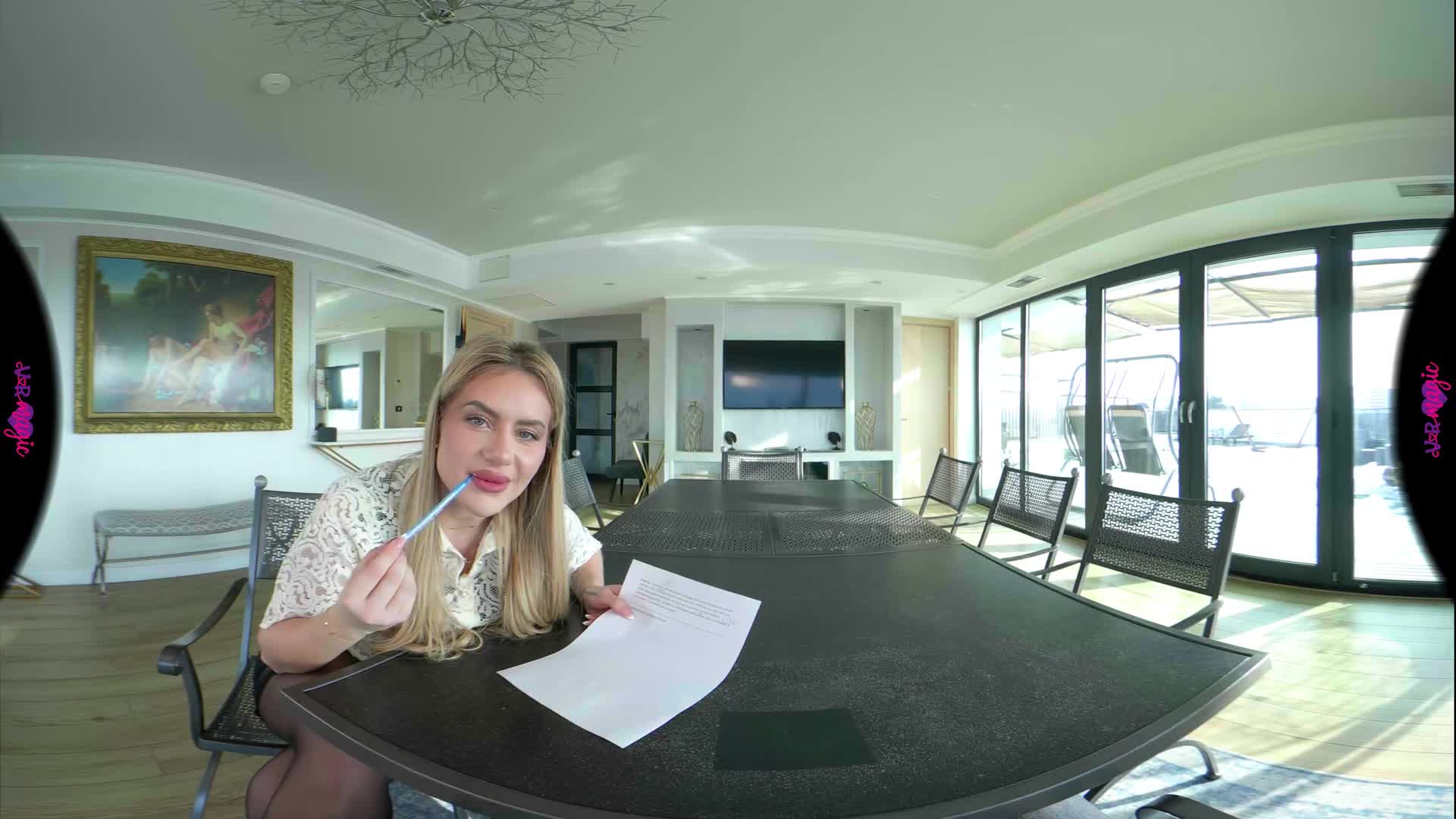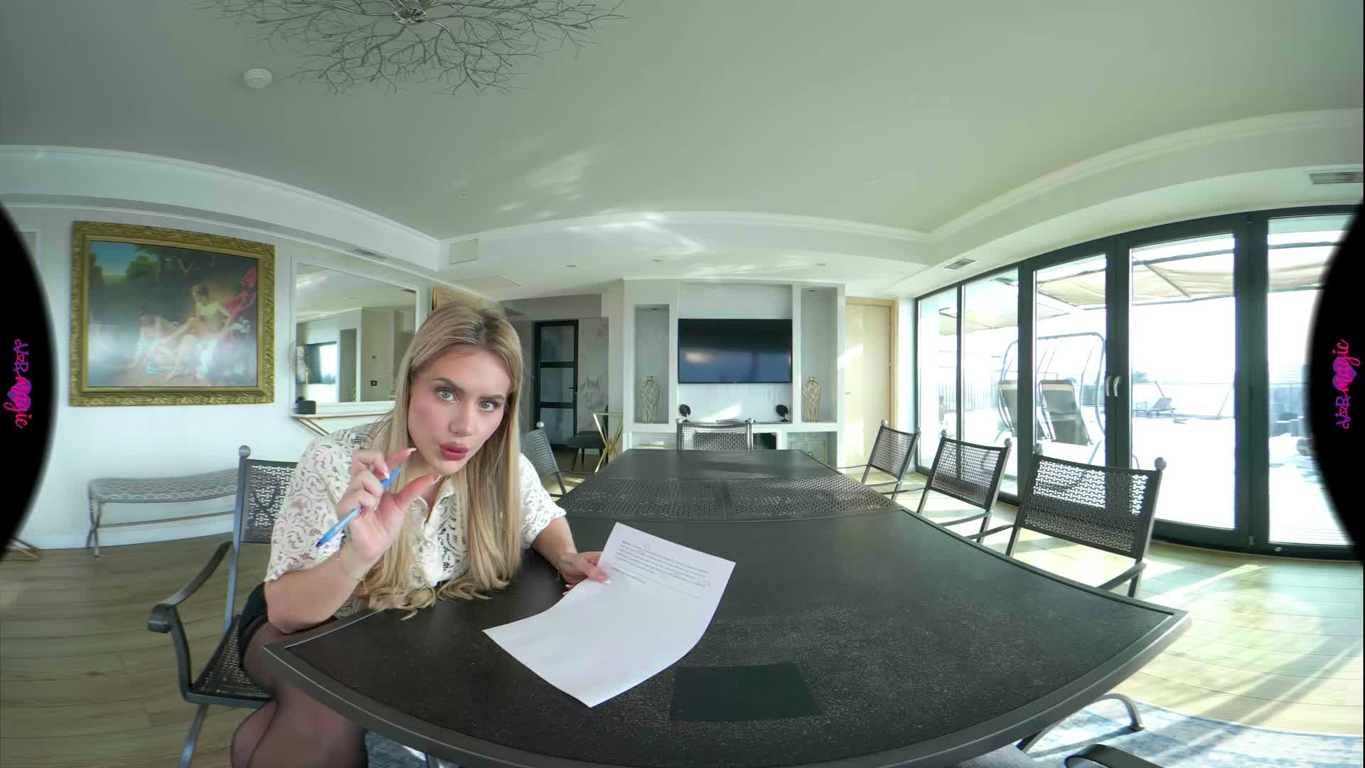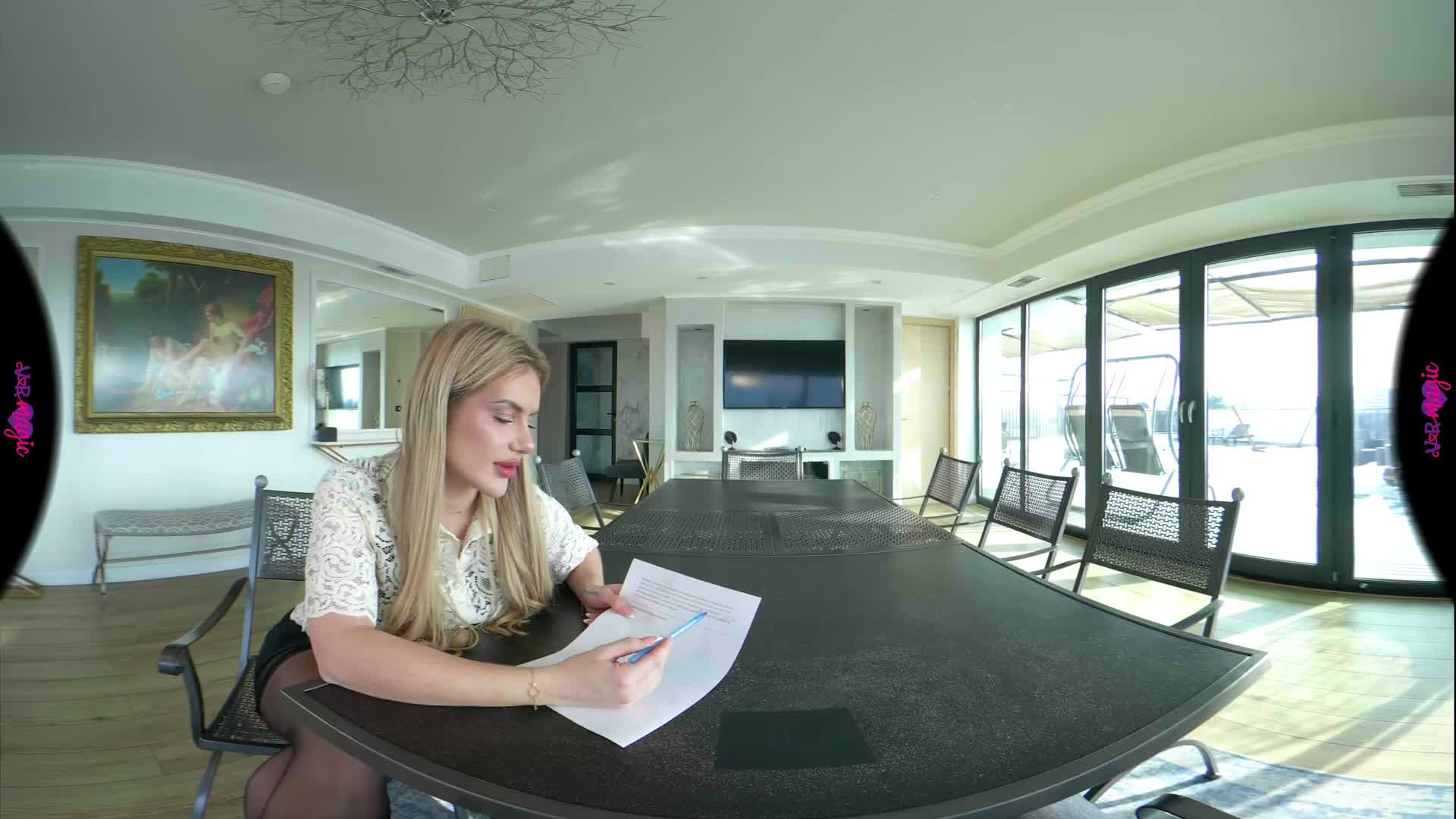 You’re sitting at the head of the table, trying to focus on your French homework, but it’s impossible. Your tutor, Georgia, is pacing around you in a tight skirt, sheer stockings, and glasses, her heels clicking against the floor. When she leans over you to correct your pronunciation, the scent of her perfume and the sight of her lace lingerie under her shirt make your heart race. She whispers that you aren't breathing properly—that you need a more "practical" demonstration. The homework is pushed aside as she slides onto the table right in front of you, slowly parting her legs. You watch, breathless, as she undresses and takes control, guiding you through a masterclass of desire. From her knees under the table to taking charge in cowgirl and doggy, every move is designed to teach you the true language of passion. By the time you're on the floor together, you realize this isn't about grammar anymore—it's the best lesson you've ever had.