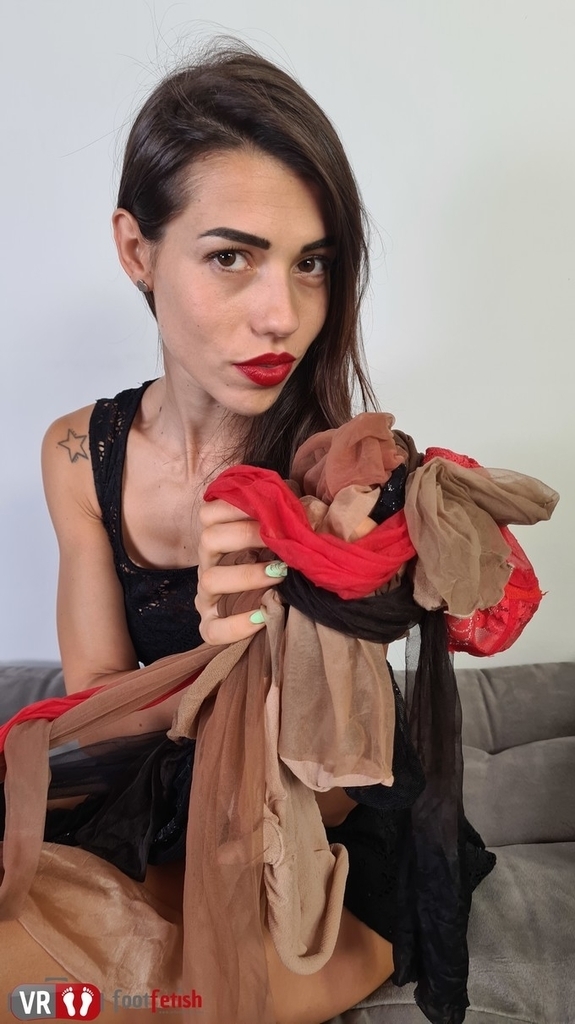 Sexy brunette Petra is flat-out gorgeous and exudes seductive vibes in a black mini dress paired with a super sexy pair of skin tone pantyhose that make her toned, shapely legs look even sexier and smoother than they already are. The brunette hottie sits on her bed, sorts through a pile of nylons in front of her, seductively shows off her sensational legs delicately encased in nylon and lures you with her amazing feet.