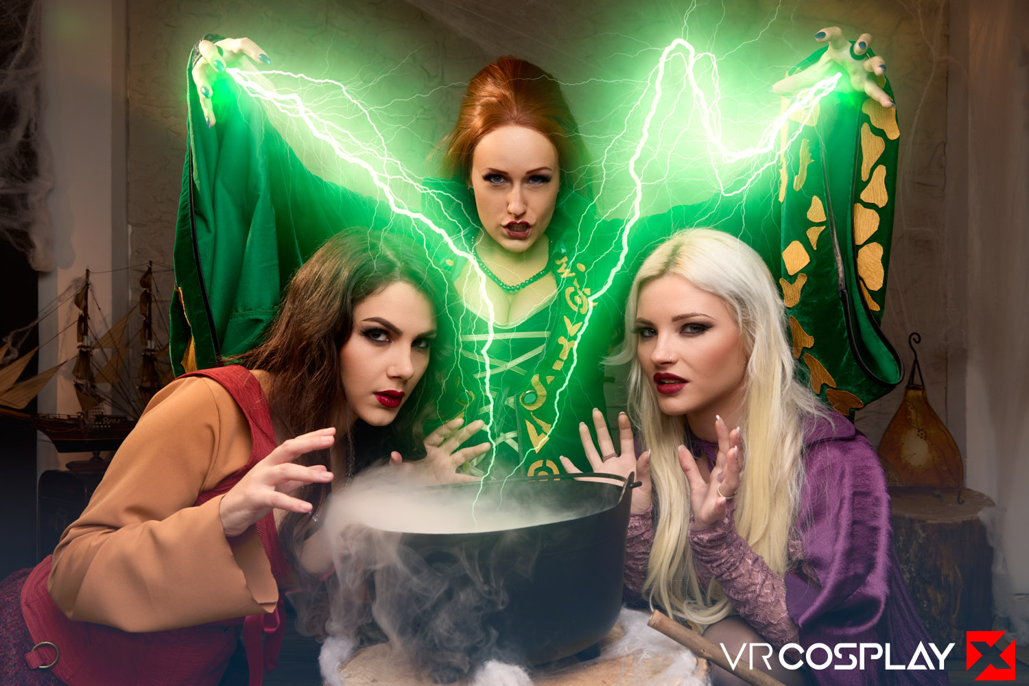 Can you believe the luck you're in? First you get a whole Halloween season of releases, and now one of our greatest ever group scenes, a fiendish foursome, is remastered in 8K. Halloween does not get better than this. We're talking Valentina Nappi, Zazie Skymm, and Angel Wicky in 8K VR porn. Now let us set the scene: the night is Halloween and you've headed out with your pal for some good old fashioned ghost-hunting. Location? The ol' Sanderson house. That's right, the one on the hill, that everyone says never to set foot in. Well wouldn't you know it? You set foot inside, light a candle, and the flame is black. That's definitely more ghoul than cool. As if that wasn't spooky enough, 3 witches, who in spite of the circumstances you have to say are smoking hot, appear before you out of the thin air. Who knows want they'll want with you? It's never something good. They've probably come to suck! Your soul. And drain! Your youth. First however, they'll have their witchy way with you. And that involves a foursome bang in remastered 8K VR with an international coven of big titty witches. What started out as a bust is quickly turning into the best Halloween ever! Go watch this foursome in incredible clarity now and be the broomstick to their pussies.
