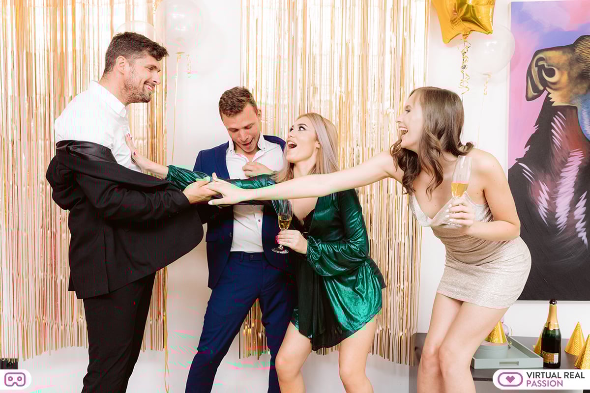 It’s New Year’s Eve and Pavlos, Stacy Cruz, Kristof Cale and Rika Fane (POV) are celebrating the new year to come with a party at home. They are dancing and toasting with champagne. But they are moving their bodies so much that they are starting to get hot. Pavlos and Kistof start to take off their shirts as they dance, showing their strong bodies. Then, they improvise a striptease while the women are in the sofa watching them. At one point, Stacy feels the need of joining them, so she approaches them and they take of her dress. From here, things just get hotter. She grabs their penises and masturbates them while they touch her. All of it in front of you while they look at your reaction. Then, they come to you and Kristof starts a pussy licking while the others kiss each other. Then, Stacy wants to taste you while the boys kiss your legs and feet. The time of fucking arrived and Kristof has sex with you while you listen the moans of Stacy who is beign fucked by Pavlos in the background. They you will do a “train of pleasure”: Kristof fucks Stacy, she touches Pavlos and he licks your pussy. The positions of this orgy will change and change for you to have the best pleasure you can imaging. What a wonderful way to start the 2023!