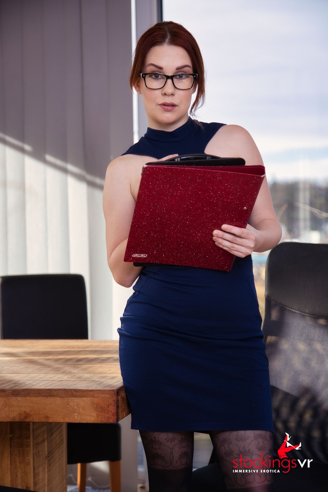 During your job interview, you notice the attractive boss wearing a form-fitting dress that reveals her black nylons. You feel a strong connection and want to be upfront with her about your love of wearing panties and stockings underneath your trousers. She seems intrigued, and after you lower your pants, she becomes even more interested. The boss reveals her own black pantyhose and panties and bends over for you. You panty fuck her then fuck her with her panties pulled down in a passionate encounter that secures your new job. Under the condition that it continues.