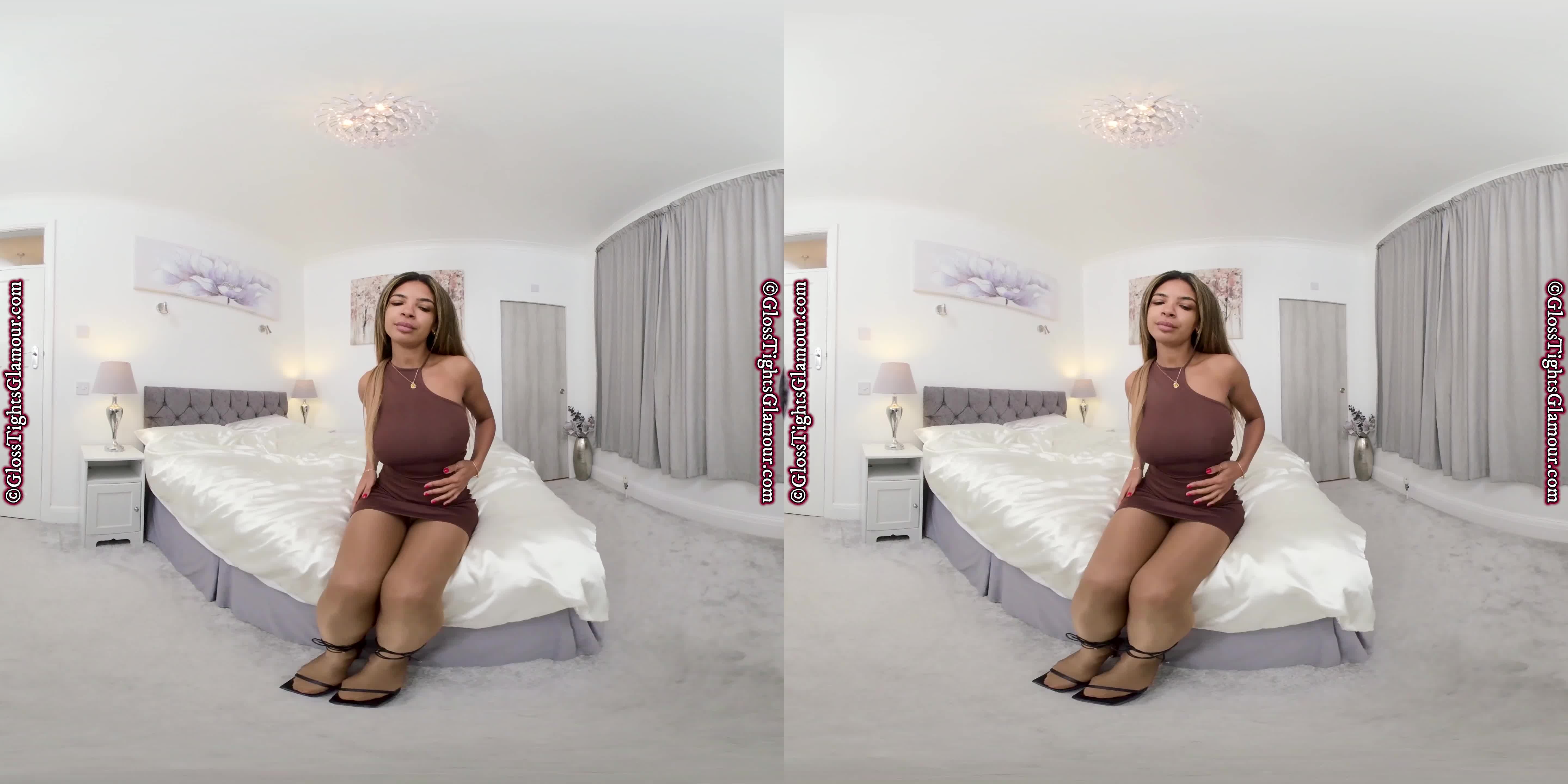 Jay makes her VR video debut wearing a stylish brown dress with sheer to waist 60 Denier copper coloured opaque tights/pantyhose, and high-heeled strappy shoes - enjoy the experience and her legwear!