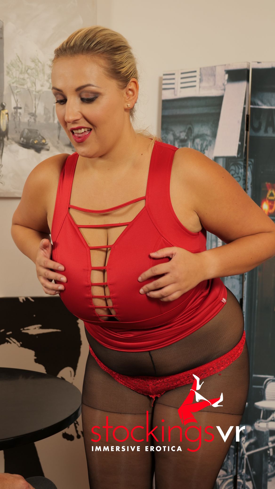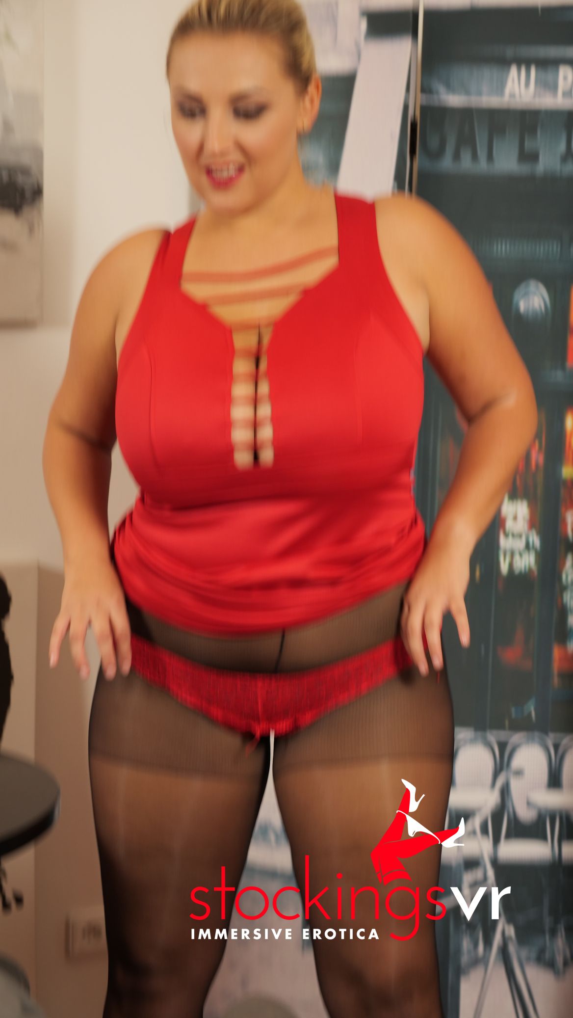 Krystal Swift is an exquisite lap dancer with alluring curves - 34G-27-38 - and her sultry moves will hypnotize you. She'll do whatever it takes to make money, so you'll need to pay up if you want to get closer. She comes to you with a knowing smile and teasingly moves her hands across her body. Her dress is pulled tight, and as you unzip it, it slides down to her pantyhose and panties. Her back arches as she shakes her enormous natural tittes and entices you. She is in control, and as you crave more, you can have it all, but only if you pay her. Her two-handed hand job and a deep, passionate blowjob destroys you when she takes your load in her mouth.