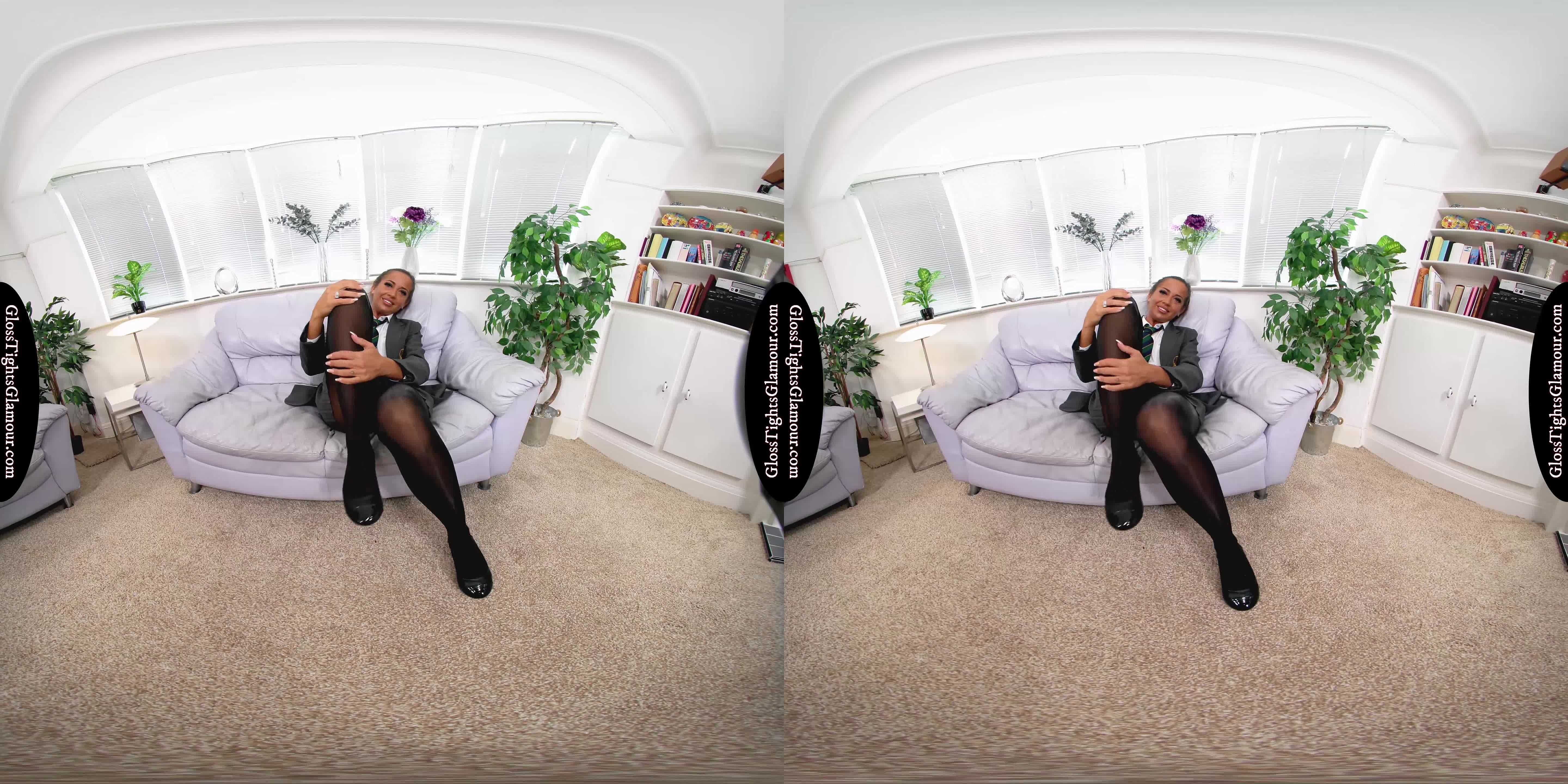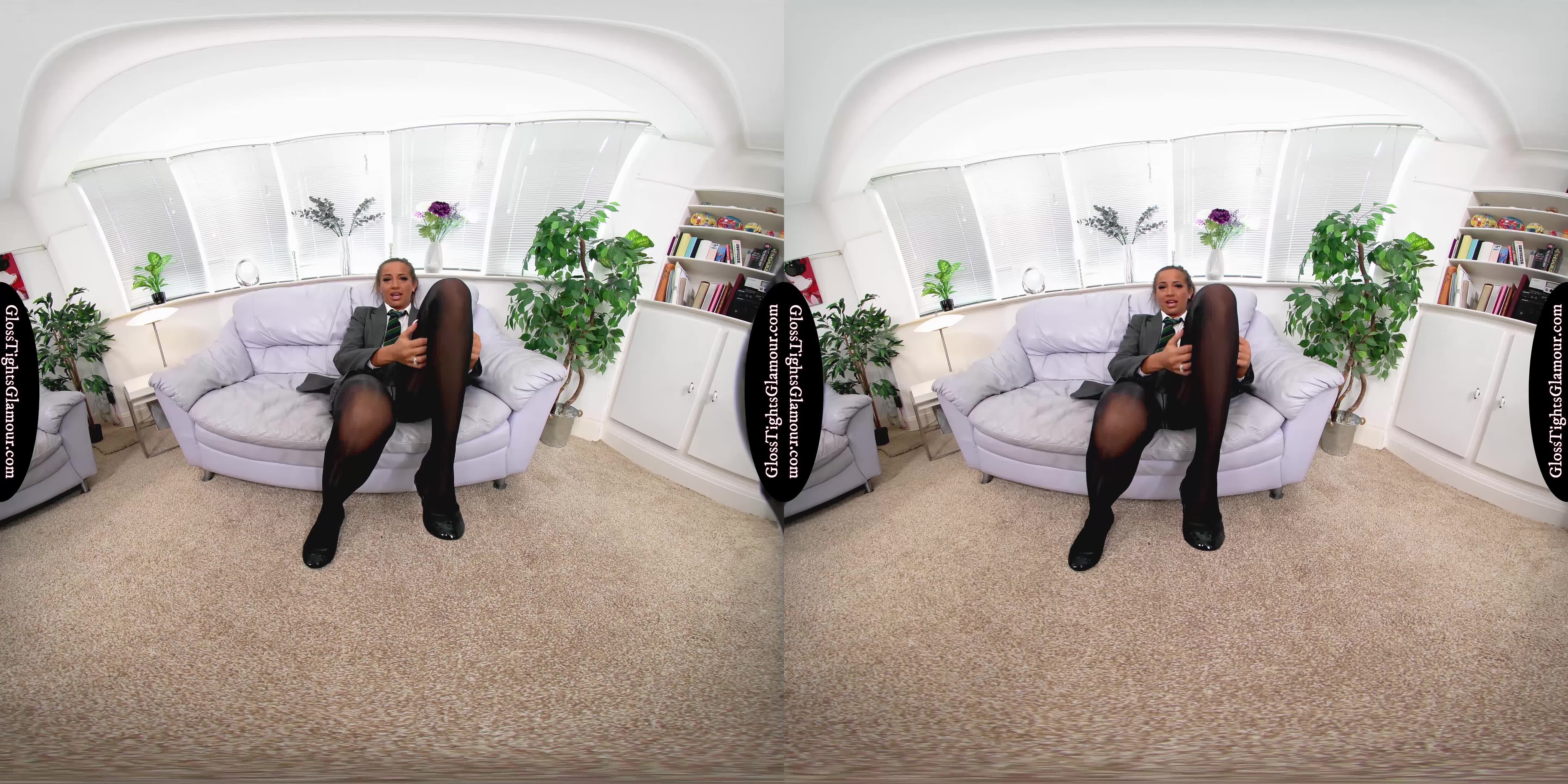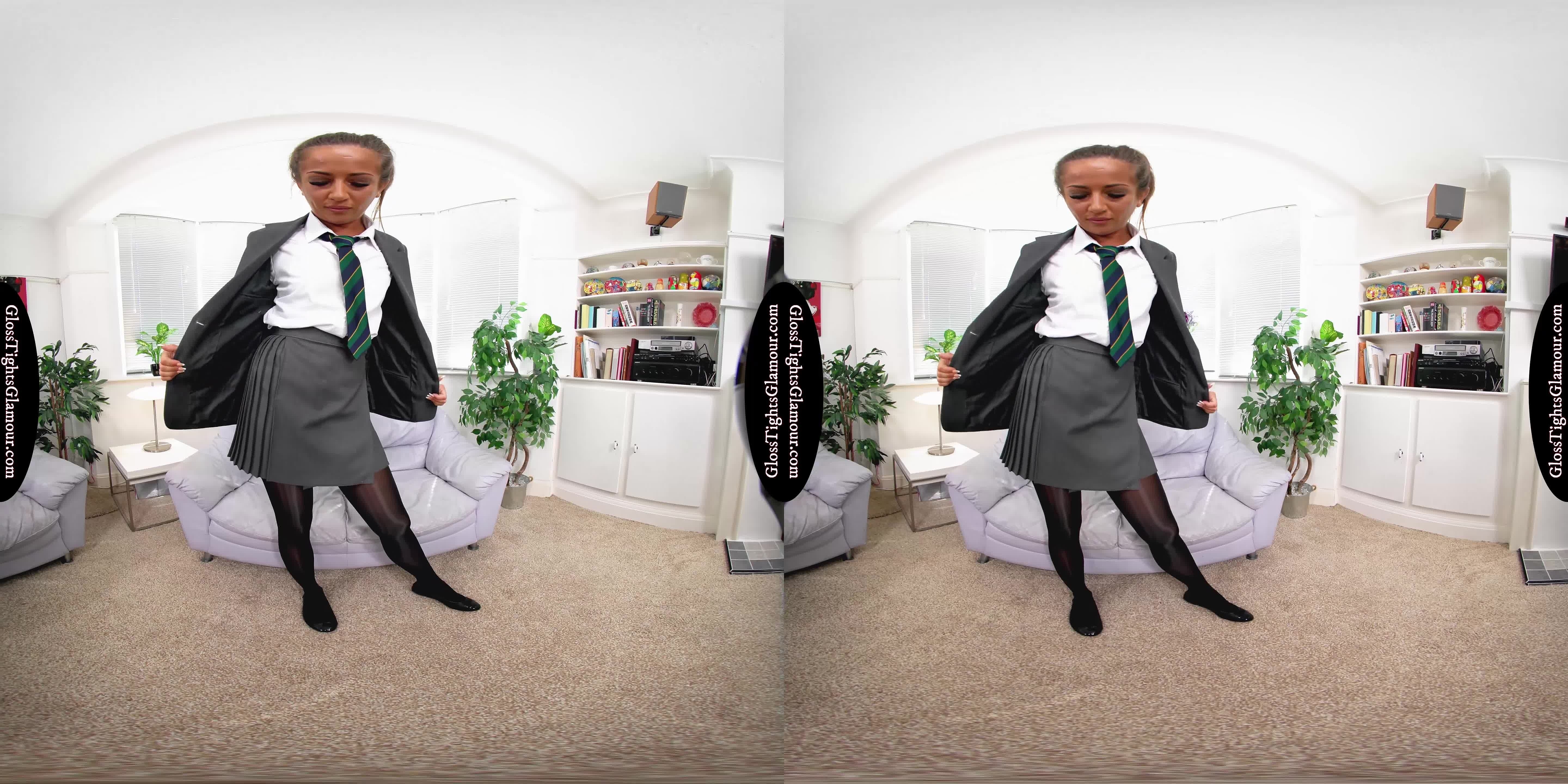 8K 60fps VR Video from shoot with Lara Lee wearing a college uniform outfit comprising: grey blazer, white shirt & college tie (sans bra), grey pleated skirt, black sheer glossy legwear with white fullback cotton briefs/panties underneath, and black ballet flat footwear that is removed to show off toes/feet,...