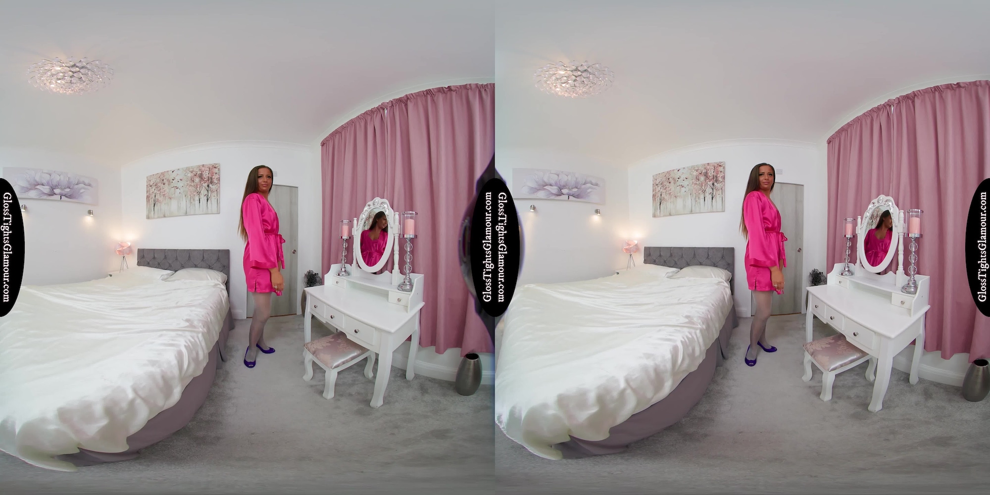 8K 60fps VR Video from shoot with Lara Lee wearing a pink silk/satin dressing gown robe with matching negligee (sans bra), grey glossy tights/pantyhose (sans panties), and high-heeled open toe shoes that are removed to show off toes/feet, in a seductive tease to topless that provides unfettered access...