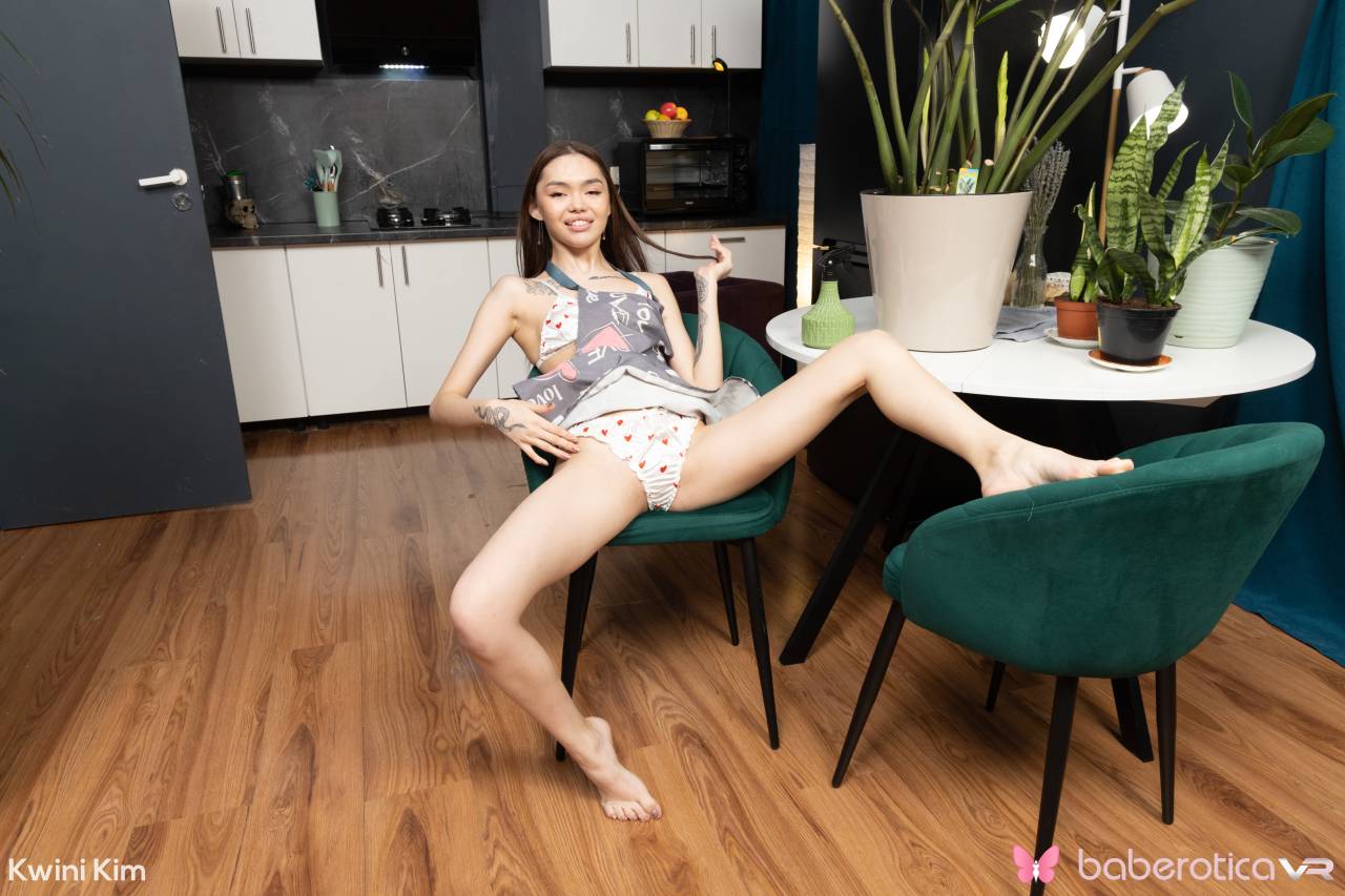 This is Kwini Kim’s second appearance on our site. And she is very enthusiastic to be back on the set. She loved her first experience with us. But what she loved more was the feedback she got from our members and the many fans she gathered from just one video. Pornstars love it when they are appreciated and when the fans are worshiping their beauty. And there is nothing not to worship about Kwini. She is basically an angel. And an Eurasian angel with a cute face and a skinny, sexy body. She is what many men would call a fuck toy. You can just pick her up and use her however you want. But until you get your hands on her, you can grab your VR headset and enjoy this immersive solo viewing experience with Kwini. She came with a different energy on the set today. She is here to have fun and enjoy some orgasms. She plays the role of the stay-at-home girlfriend who just keeps the house clean and waits for you to get home and fuck her. Whenever you’re not home when she is horny, she just grabs one of her many toys and takes care of herself. She put on a nice strip show for the camera while looking straight into the lens in such an inviting way. She then grabbed a massive dildo, which is as thick as her wrist, sucked on it, and pushed it inside her little cunt. Not only is this video good, but the gallery that comes with it is also crazy hot. Check them both and let this skinny little angel make you cum tonight.