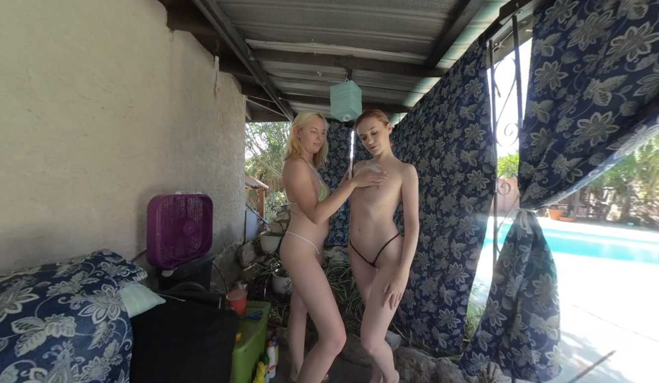 Emily Bloom gets ready to sit poolside with her friend Bailey by taking turns rubbing lotion all over their naked bodies.