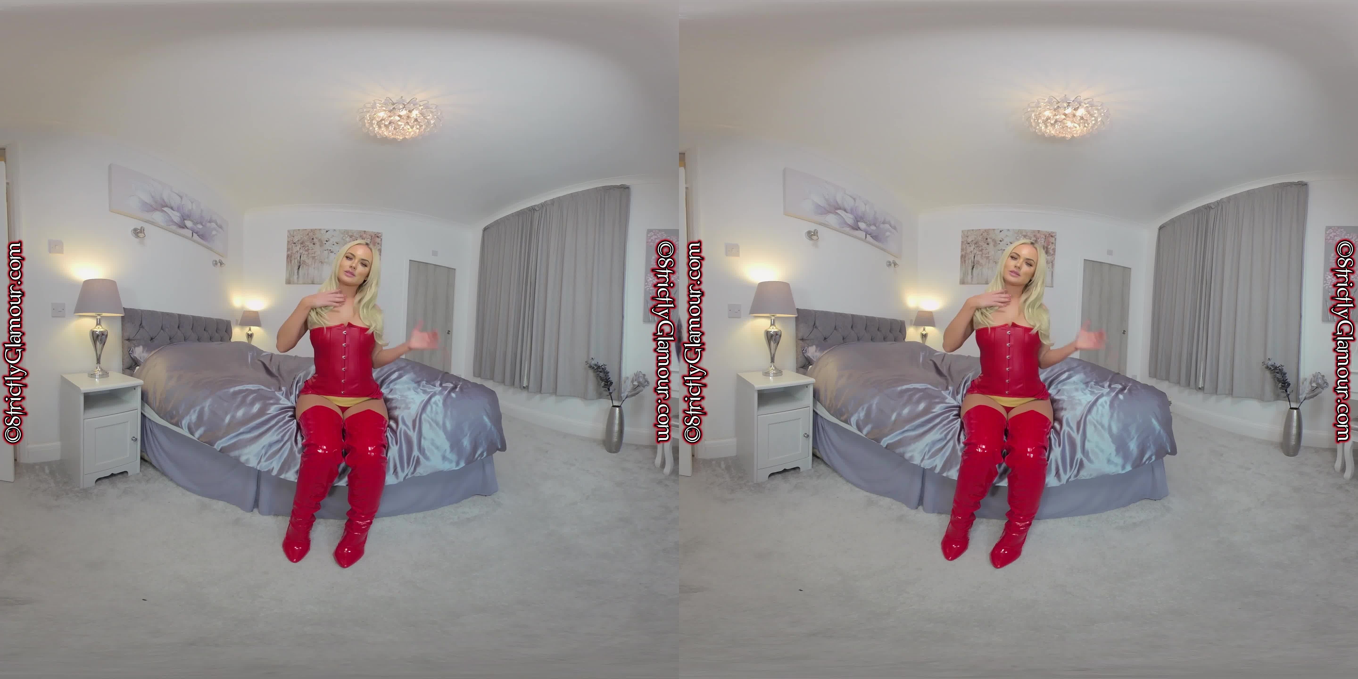 Blonde goddess Louise will leave you in a daze as she performs a seductive tease wearing a red themed outfit with leather corset & skirt and thigh-high stiletto heeled boots - all she demands is that you pay her full attention as she raises the temperature to reveal her incredible body!