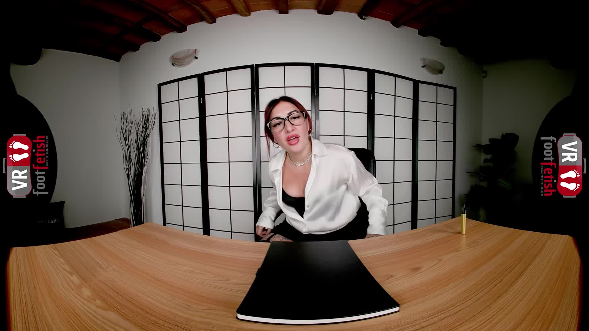 Picture yourself summoned by the strict, seductive Professor Miss Ossidiana after failing her class. Dressed in a crisp white blouse, tight skirt, jacket, sheer black thigh-high stockings and sky-high Louboutin heels, she stares you down through her glasses with pure authority. Without mercy, she places her perfect feet right on the desk in front of your face and commands you to lick her warm, wrinkled soles through the thin nylons. Feel every curve and texture as she verbally humiliates you with cruel, irresistible dirty talk. Things heat up fast: she climbs onto the desk, slowly removes her skirt and blouse, leaving only her sexy lingerie, and continues dominating you completely. Her flawless feet in those towering heels tease, crush, and smother you while she makes you beg for more. In this ultra-immersive 7K VR experience, her soles and toes will feel so close you can almost smell their intoxicating scent and feel their heat on your skin. Surrender to total foot submission with the goddess Miss Ossidiana.