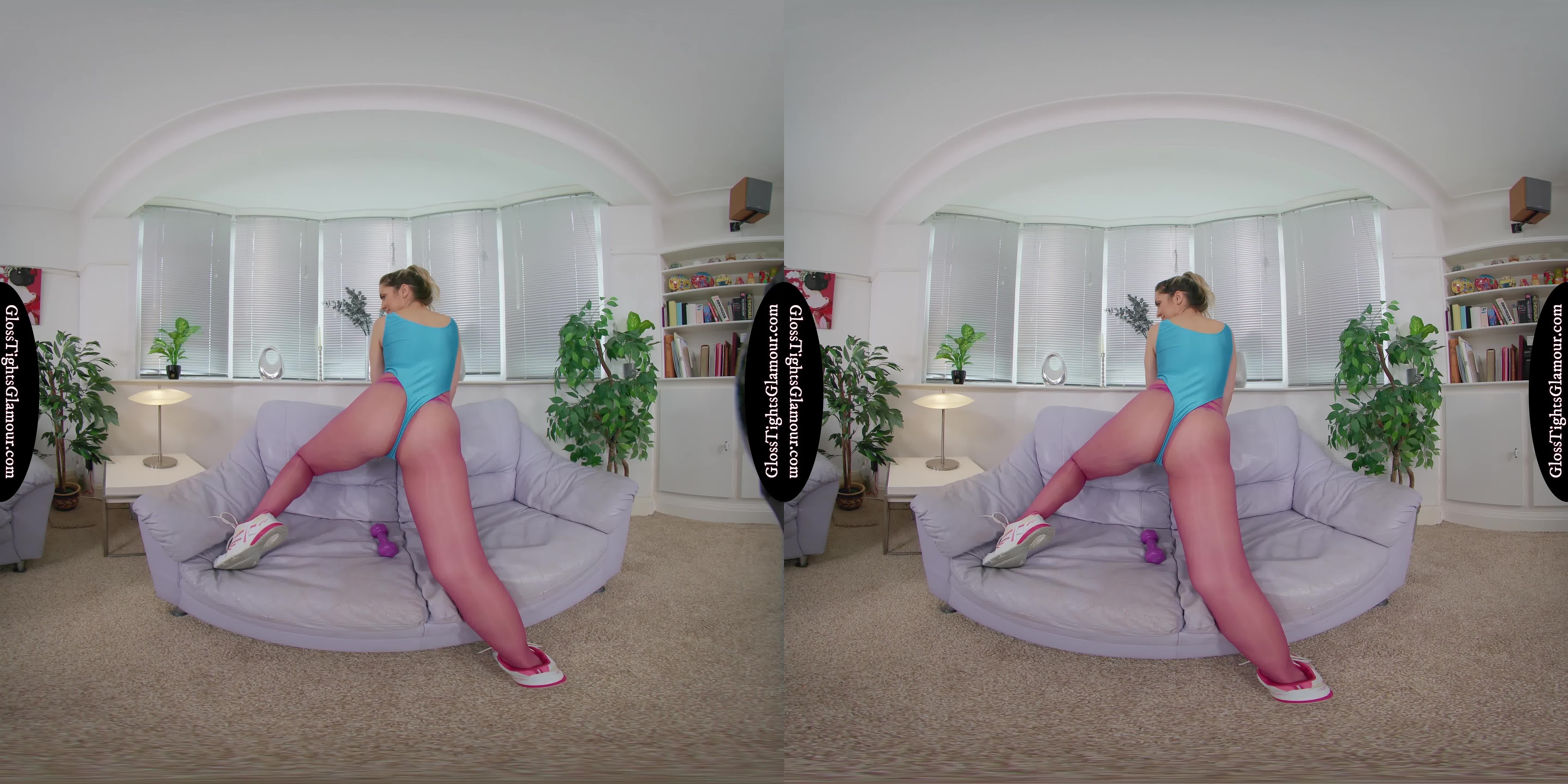 8K 60fps VR Video from shoot with Miss V wearing a 'gym' outfit comprising; blue leotard (sans bra), flat heeled trainers/sneakers that are removed to show off toes feet, and pink/fuchsia glossy legwear with lacey briefs underneath, in a tease to topless that should give everyone a really good 'workout'!...