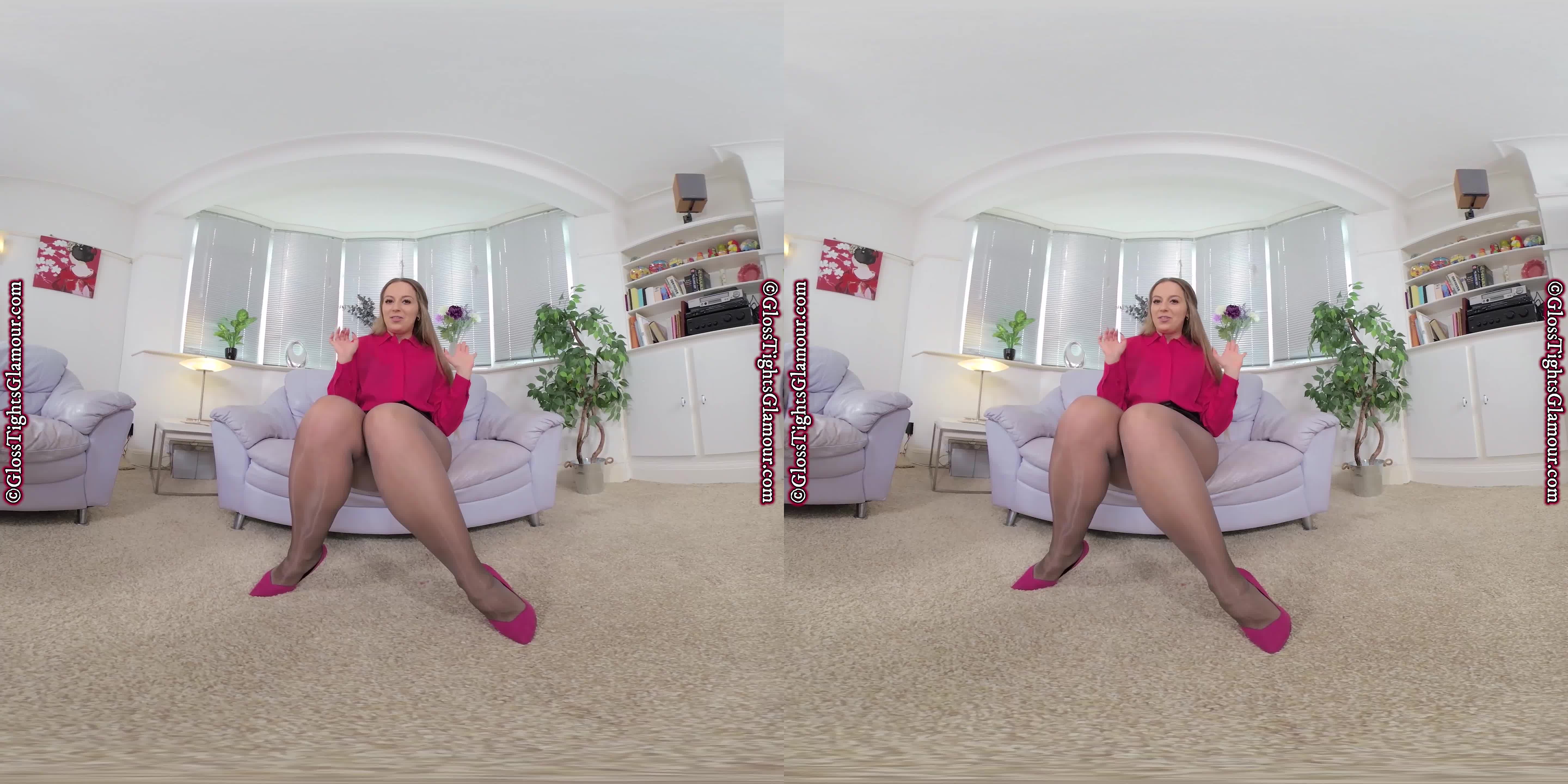 VR Video from shoot with Monika Lara Smith wearing a red satin/silk blouse/shirt, black skirt, matching blue bra & panties lingerie set, grey glossy tights that are removed and replaced with black glossy legwear with similar attributes midway through, and high-heeled shoes that are also removed to show...