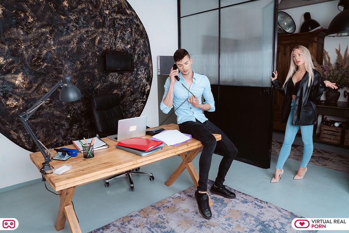 The executive manager Angie Lynx is coming to see you. You are on the phone, speaking with a client. When she realizes that you were speaking with the boss of that firm, she tells you that he was flirting with her the whole conference… and he is hot! When she sees your face, she laughs and tells you that you don’t have to be jealous, because you are the only executive that she likes to fuck with. She gets close to you because she is horny and she wants to have sex with you, but you keep working. She knows how to convince you… she kneels and gives you a blowjob. After that, she rides you and you stick your cock in her while she touches herself. Seeing her naked body and fucking with her like that makes you feel better. You stand up and keep fucking from behind with her in doggy style, while she bends against a table. You will have anal sex with her after that in missionary position and she will masturbate you until you cum. Sex in the office is the best!