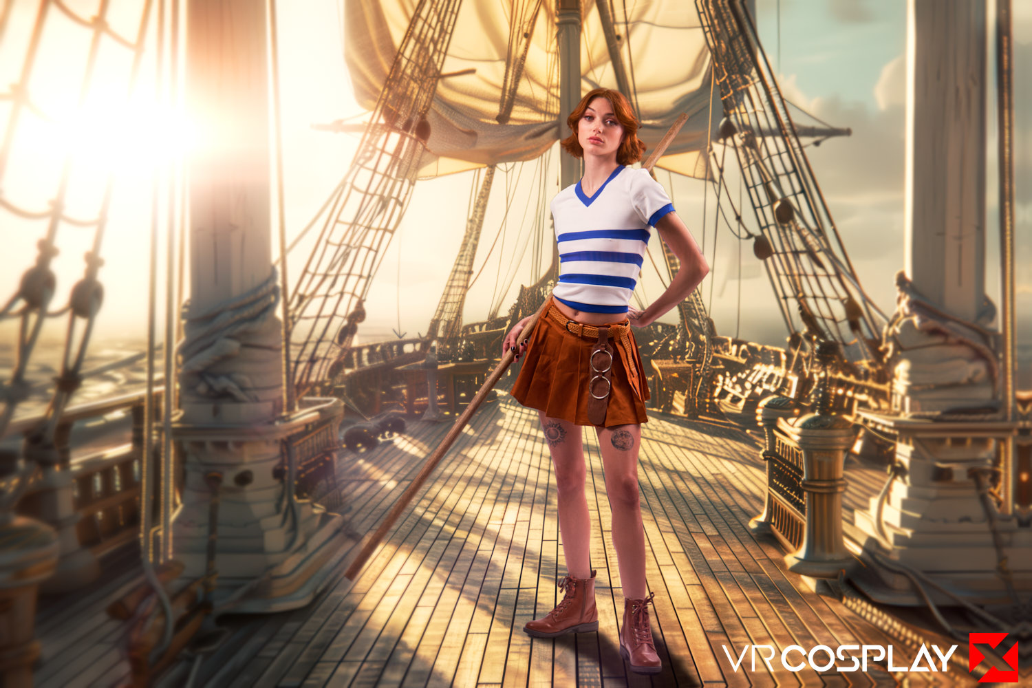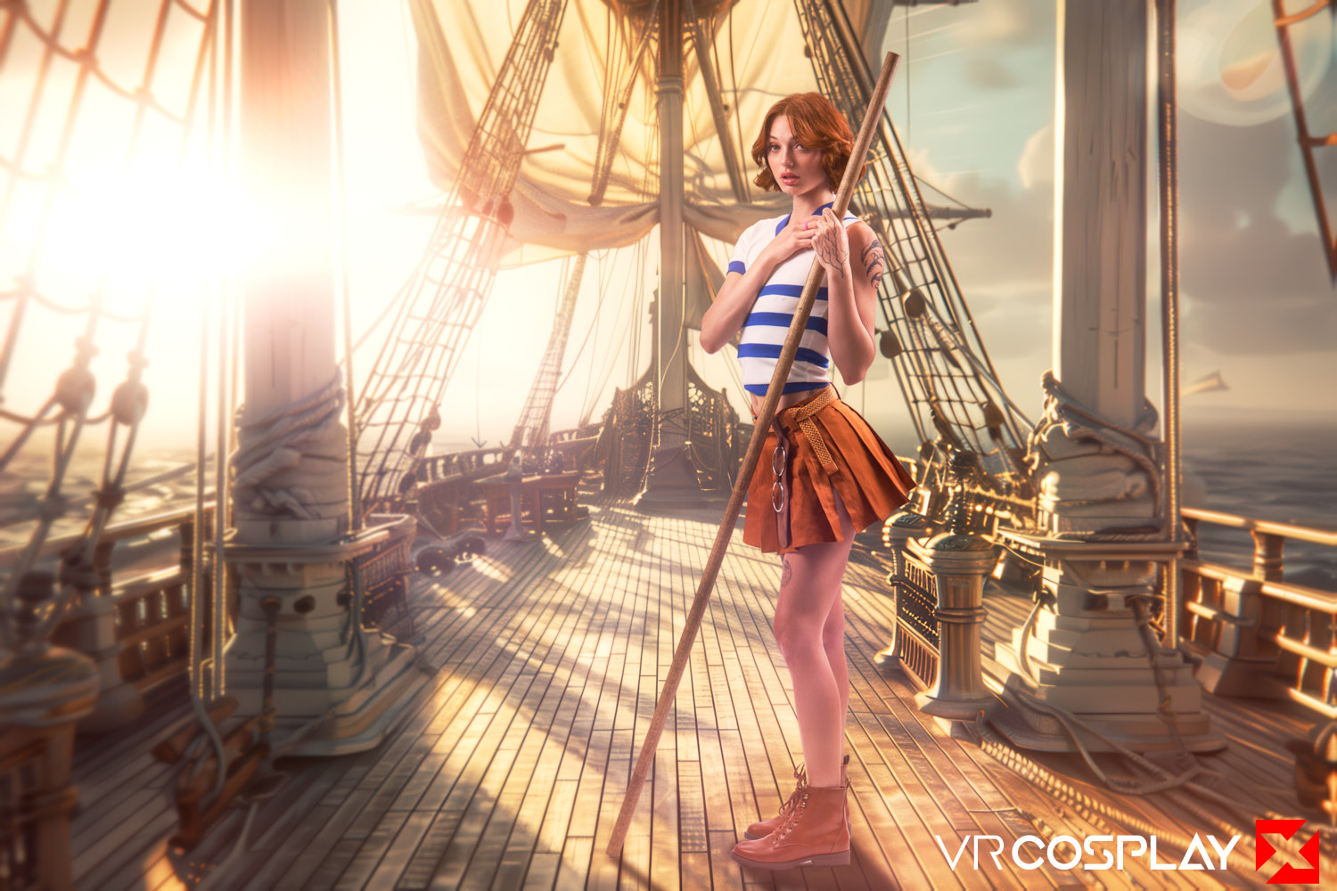 Truly a crafty and crooked young lass, but you cannot deny that she had a good ass! Nami is Luffy's right-hand woman and the most crucial, if a little reluctant, member of the Straw Hat Pirates. She's a well-traveled and seasoned redhead pirate with a thousand special skills to deply, a million stories to tell, and an ever-increasingly likelihood of getting a serious bounty from World Government forces placed on her smart, beautiful head. She can be defensive when she first gets to know someone, and that's the case with you today. That's kind of a natural posture to assume in the world of the pirate. Everyone, and that means everyone, is out to get something from everyone else. Everyone got into the search for the One Piece for their own strange reasons and with their own driving motives. All that being said, once you get beyond her tough, elusive exterior you'll find that she's warm and very, very adventurous. As one of the greatest swordsmen she's ever met, she's already pretty impressed with you. Now it's just to play your cards right with her and hopefully that long staff isn't the only wood she'll be wielding tonight. Get up close and sexual with the magnetic, gorgeous Shrooms Q as Nami from the live action series One Piece. All great fighters call out their finishing moves, so she's guaranteed to let you know when she cums!