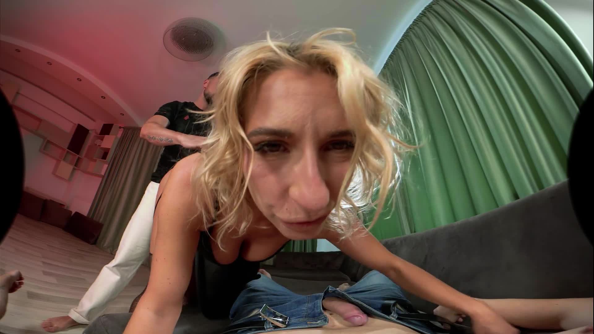 It is a lazy day - you are just chilling on the couch, but at some point Nina comes to you sexy and mysterious, with her blonde hair untied, wearing a sexy dress. She tells you that she has a way of paying the debt - a little bit unconventional. She brings the guy to you and she starts sucking both your cocks. Richard fucks her from behind as she sucks your cock, then you fuck her ass in cowgirl and reverse. You double penetrate her as she screams of pleasure. You both cum in her mouth and the debt is finally paid.