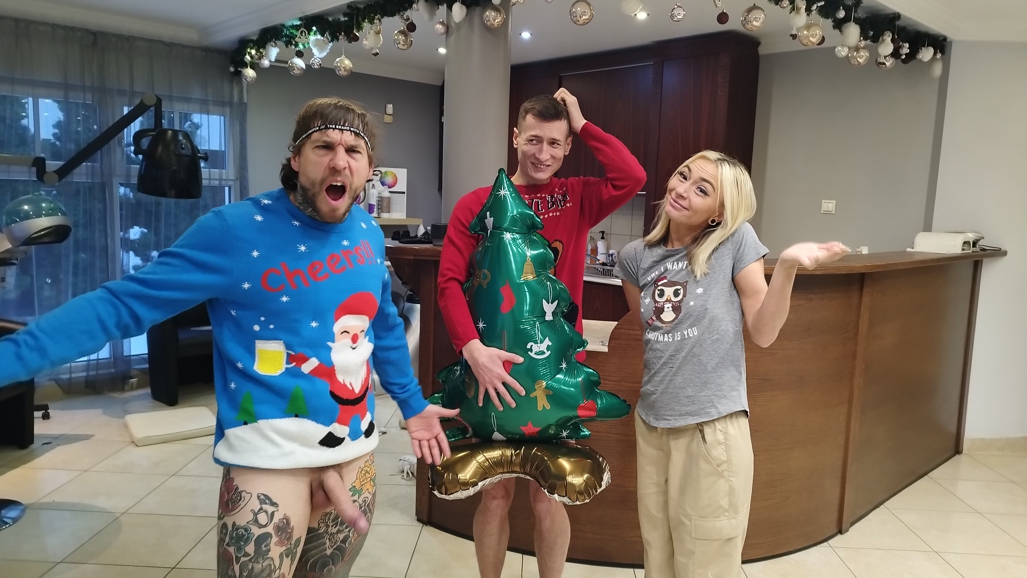 The first section of a virtual reality (VR) Christmas trilogy featuring bubble butt baddie Chloe Temple. Filmed from a behind-the-scenes, aka voyeur angle, so you can experience what it is like to direct a porn scene. It is Christmas time, and Charlie Dean visits the beauty salon where his friend Chloe Temple owns. Chloe Temple is the fiancé of his former best friend, Dean Van Damme. CharlieDean and Dean Van Damme have had a falling out. Charlie got fired from his job and banned from his favorite bar because of Dean’s antics. Charlie tells Chloe Temple that even though Dean is a troublemaker and gets him into trouble all the time, he misses their friendship. Chloe Temple tellsCharlie that she agrees and that they may have fun since Dean is not around. Charlie tries to resist the sexual advances of Chloe Temple but is unable to control his lustful feelings. Charlie bangs the sexy blonde with a bubble butt and a sexy bush all over the hair salon. Just as Charlie shoots his cumshot all Chloe Temple, he hears Dean knocking on the door. What will happen in part two? Keep your VR headset on and find out.