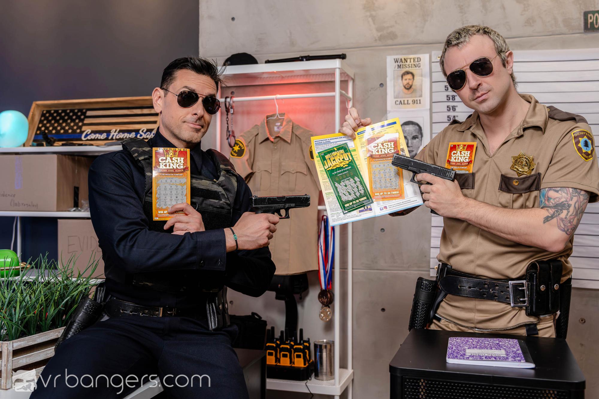 Welcome to VR Bangers’ latest spin-off of a hilarious show where America’s most unqualified deputies stumble upon a winning lottery ticket—and all hell breaks loose. Greed and questionable policing collide, as the Reno Sheriff's Department tries (and fails) to keep it together while chasing the dream of instant millions. But can this already hot mess turn into something sexier? It most certainly can, inside our virtual reality porn movie! Reno 911! The Lottery (A Porn Parody) is our latest parody VR porn fantasy that will put you in the middle of a drama as a new police officer on his first working day. It's a usual day, everyone’s chilling before the shift—when suddenly two of your colleagues, one after another: Trudy Wiegel (Hailey Rose VR pornstar) and Clementine Johnson (Ryan Keely VR porn actress) burst in and start throwing insults. They both won a lottery ticket and declare they’re millionaires and don’t want to hang up at the station anymore. However, it won’t be long until one of the officers shatters their illusions, showing the exact “lottery ticket” and explaining that it's just a coupon for a free car wash. It will turn this babe VR porn video into an outburst of laughter and fun, while the two vixens sit on the bench sad and disappointed. You know what they say: the higher you fly, the harder you fall! But not everything is lost—if they apologize properly, they could still save their faces. All the other cups will have to start their work, and you’ll be left alone with these two. Long story short, this is where the actual thrill will begin, as these slutty chicks will try to change your picture of them in a most seductive way. On top of that, they heard some rumors about that enormous stick hiding in your pants and this MILF VR porn scene will be the perfect opportunity to find out. Looks like someone still has hit the double 8K UHD jackpot today, haven't you?