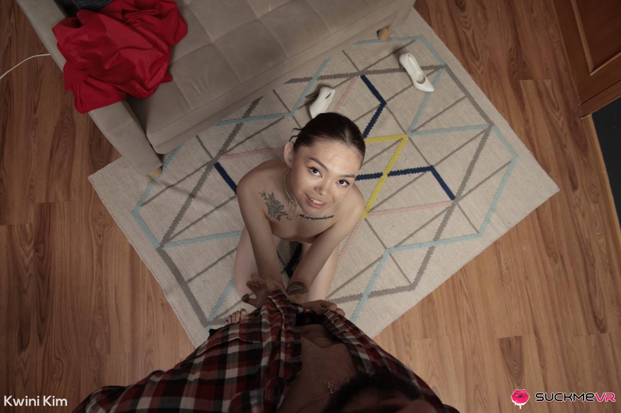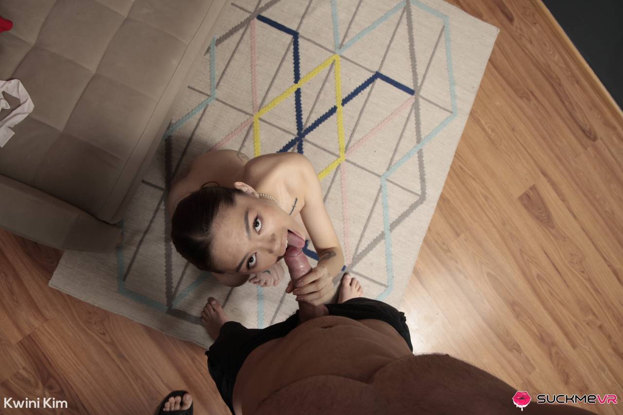 Imagine this: you’re the lucky guy who took Kwini Kim out on a date. She dressed nicely for you, and you’ve impressed her with both your choices for fun and your manners. Now she wants to show you her gratitude, and she takes you back to her place. Before you know it, she jumps out of her nice red dress and is fully naked in front of you, offering herself as a dessert after a nice dinner. That would be wonderful, wouldn’t it? Well, you don’t have to imagine too long, because you have this POV VR video in which that’s the exact story. When Kwini gets naked, your heart will stop. You already know her, but a skinny body like hers is always impressive. She takes off her panties and bends over to show her holes before starting to pleasure herself with her fingers. Such a show would make anyone instantly hard. She did it because she could sense the big dick energy in our friend, and she had to warm up her pussy for his meat. She got down on her knees, took out that cock, and started worshiping it. The dick looks twice as big in her delicate hands and dirty little mouth. The way she sucks on that dick while playing with her pussy is maddening. She worshipped that cock so nicely before turning around and letting it impale her tiny little twat. She moves on that cock like on a pole. And she even needs breaks before she can get on top of it. In these breaks, she gets back on her knees and sucks on that cock, tasting the sweet juices off her pussy. When she finally makes it on top, she rides with so much grace. But again, she is way too tight for that veiny shaft, and she always needs to take blowjob breaks. After a lot of fucking, she finally makes that cock cum in her mouth and on her perky little tits.