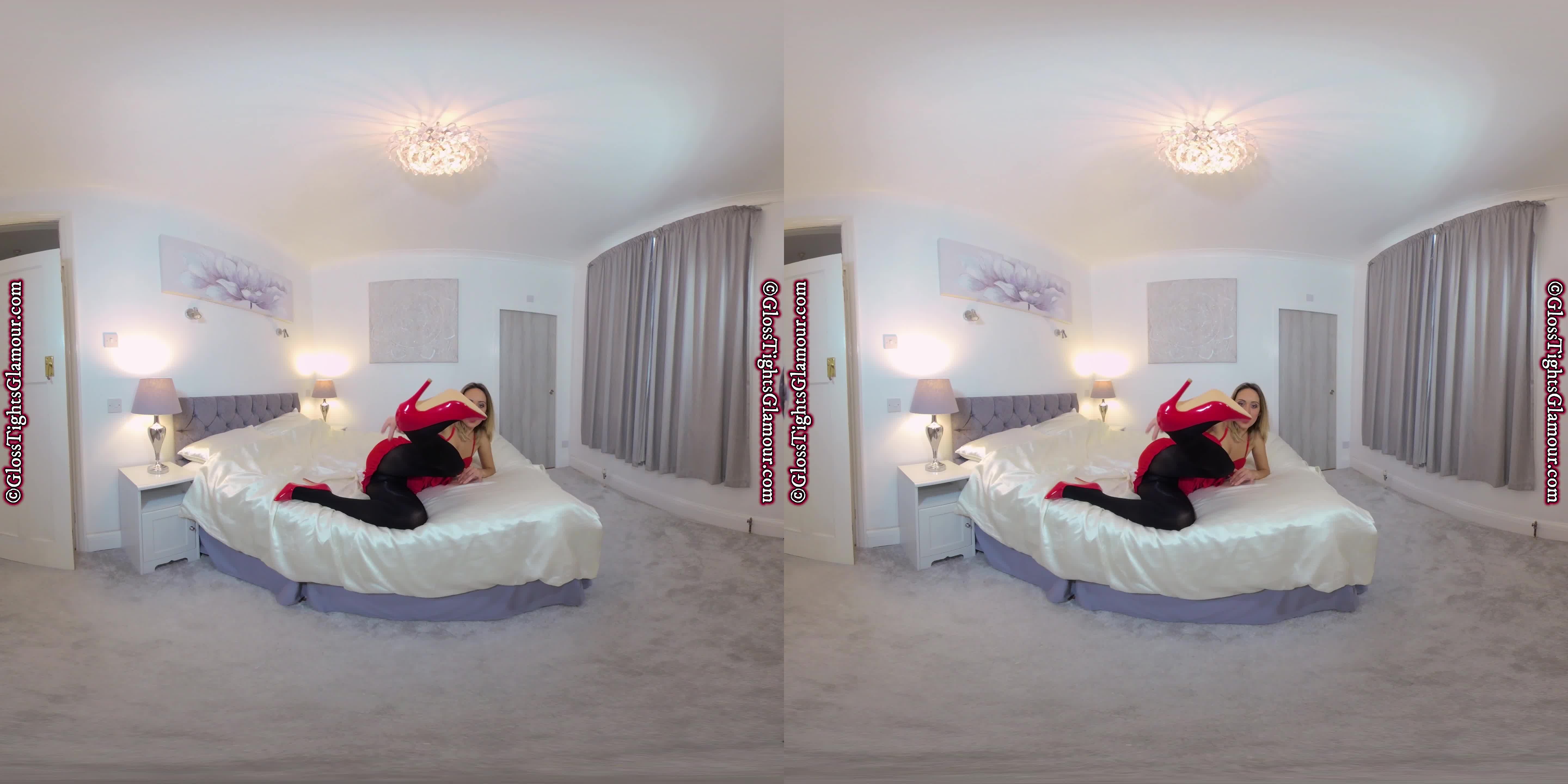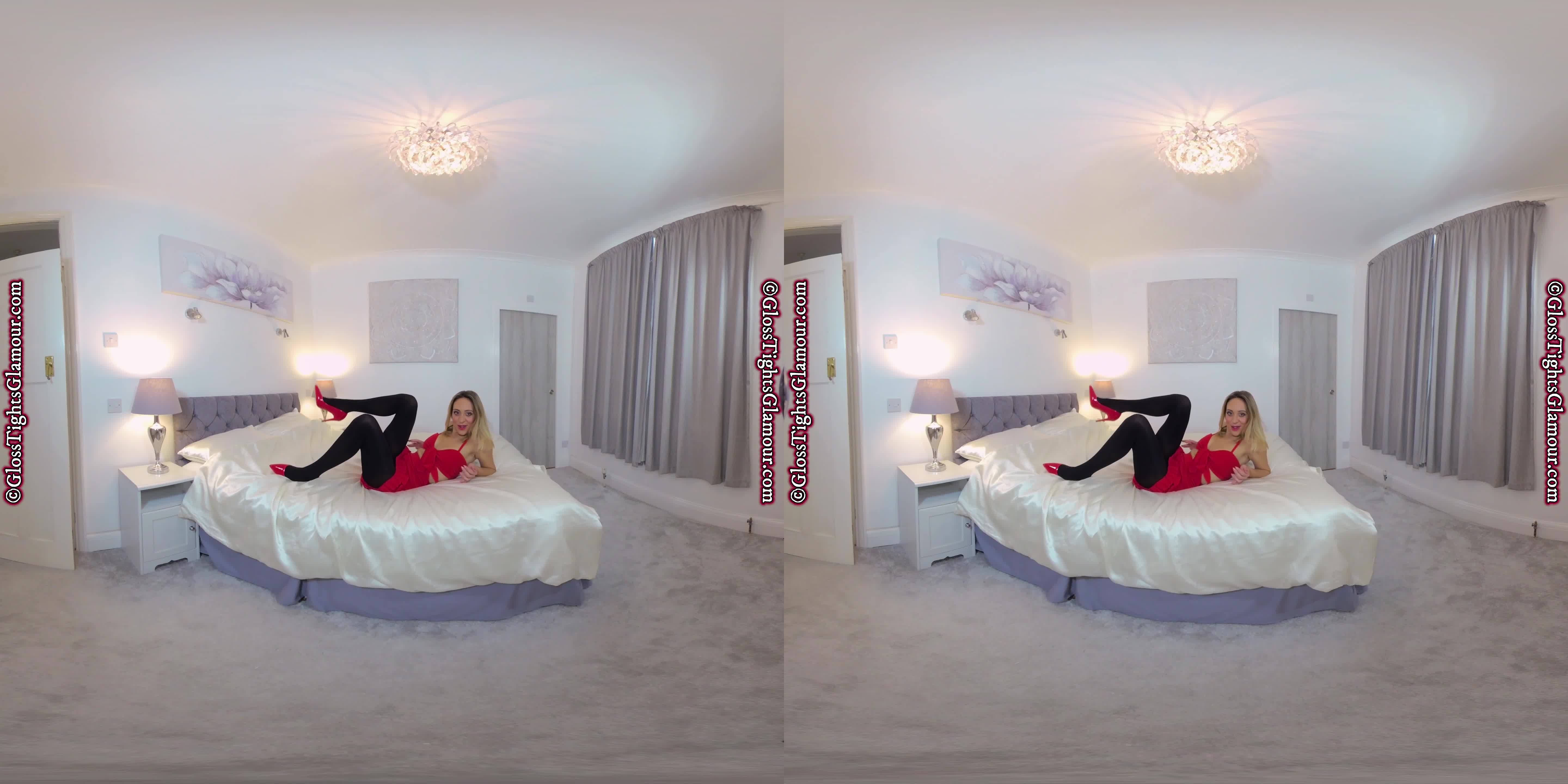 Samantha is so happy to show off her outfit and takes great pride and enthusiasm telling you about her red crop top, matching red rara skirt and of course, her magnificent shiny glossy legwear - indeed she is so happy that she decides to provide you with a treat as she strip teases to show everything...