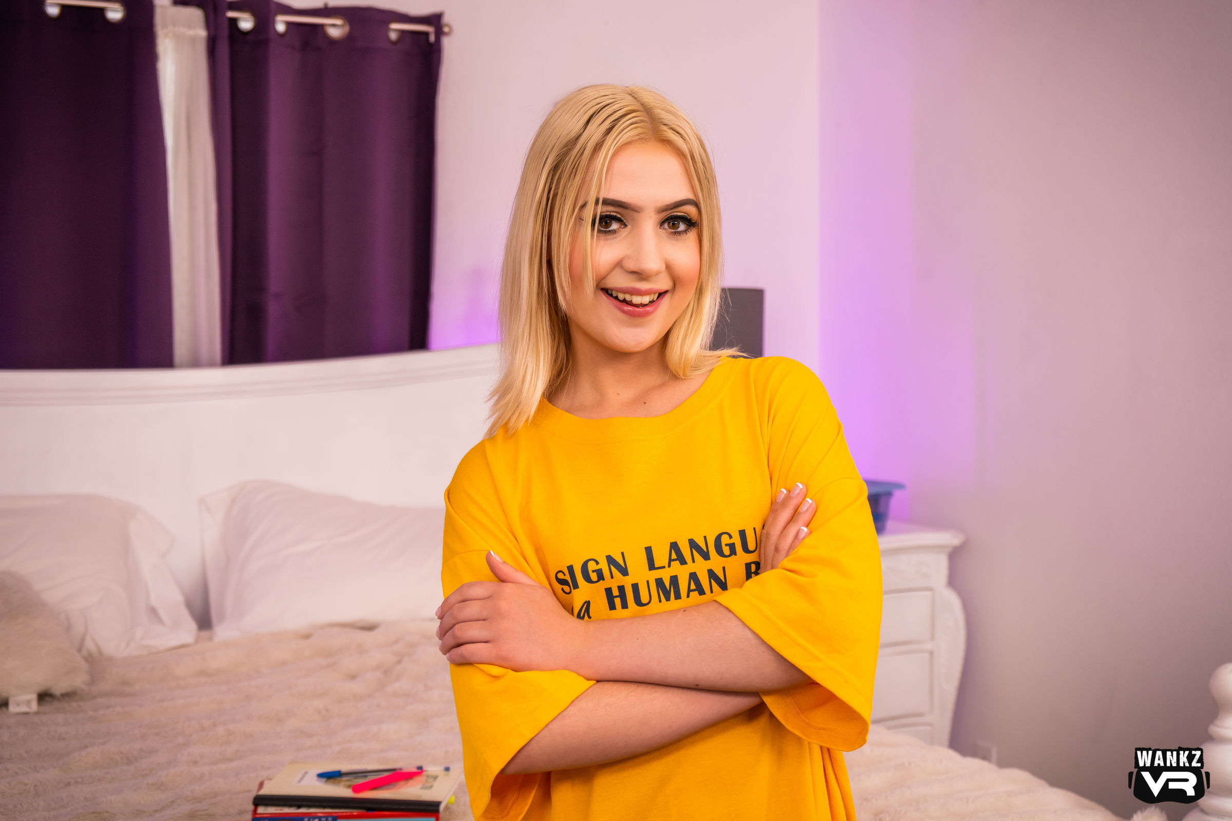 Get those fingers wiggling and warmed up because today you'll be learning some sign language! Daisy Bean has been your tutor but if you're gonna' get into that sign language program, you'll need to bone up on your skills. She will put you to the test but when you mix things up and do a naughty sign, she'll let you know. Don't be embarrassed, this happens all the time! This flinger slip will turn into much more when things heat up between you and Daisy. If you promise not to tell anyone, this blonde cutie will suck on that thick dick and ride on it too! Show her what you have learned and teach Daisy a thing or two about fucking! Pound her sweet pussy doggy style and missionary too. In the end, you'll be filled with knowledge and she'll be filled with cum. Mix education with VR porn in this steamy encounter!