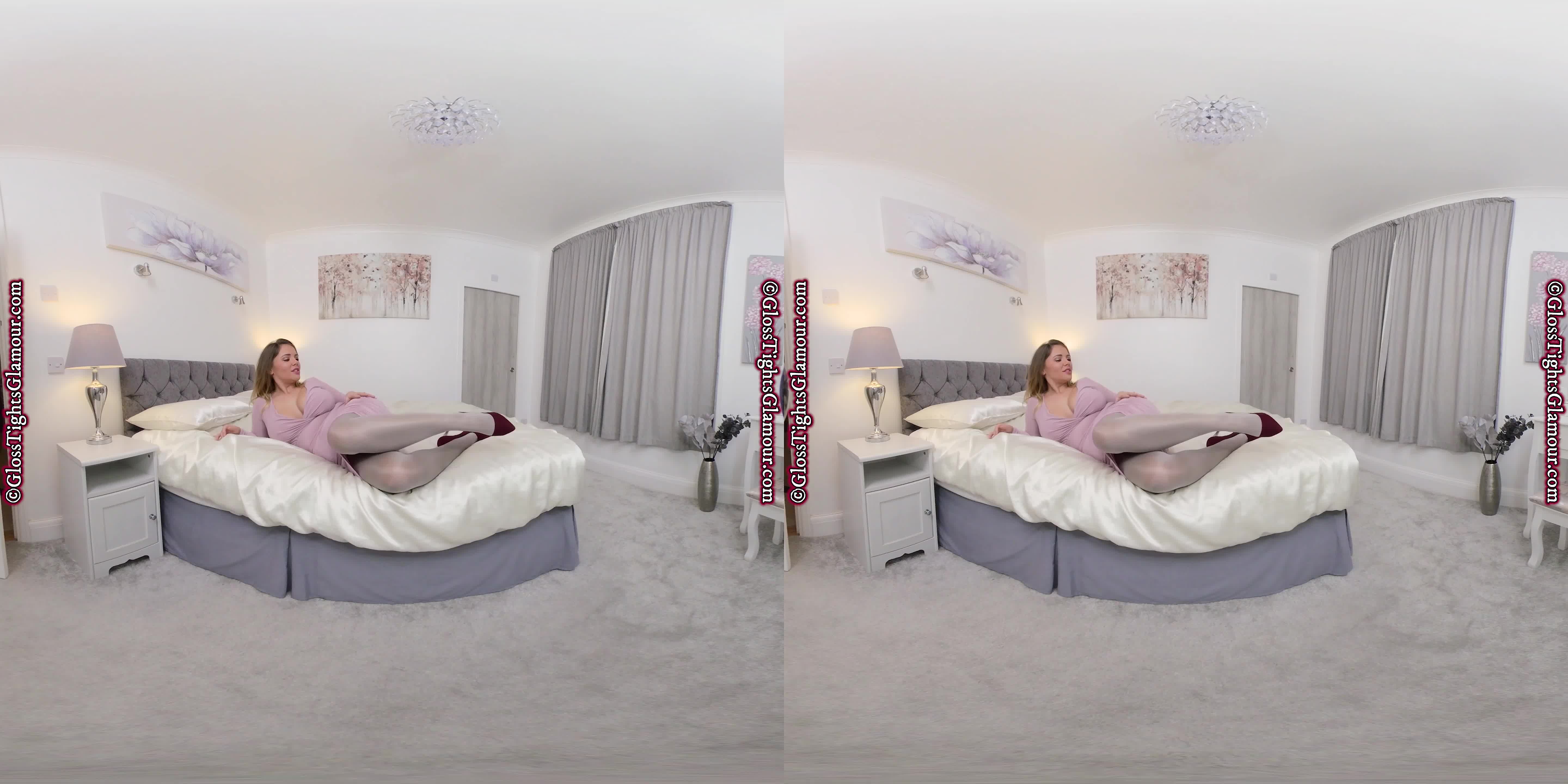 Siobhan smoulders red hot from start to finish in this mesmerising VR video as she presents her outfit today with lilac dress that hugs all of her glorious curves, and of course the main attraction, her grey glossy legwear - a sheer delight for all!