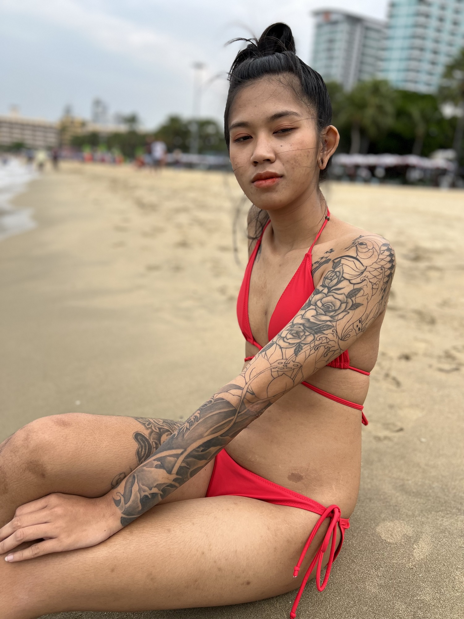 You are on vacation in Asia and while walking towards the beach, you spot a super skinny lady with a lot of tattoos and high heels. For sure a bargirl. Turns out she is alone and walking to the sea. There she takes out her clothes to show off her red bikini. You walk towards her asking if you could make a few pictures of her. She likes that and starts to pose for you, laying down in the sand and walking sexy. Something is in the air and you need to take full advantage of the situation. Her name is Fat, she is a 19yo bargirl having her day off. You ask her if she would like to make some more pictures in your hotel room and of course she knows what you’re hoping for. She gladly accept and you both take a motorbike taxi to your place. It’s there where the real party starts with her giving you a little dance and gladly helping you to take off your pants. This was just meant to be and you are getting a good bargirl treatment , fucking her in different positions. When you come, she wants you to come in her mouth for her to drink it and enjoy!