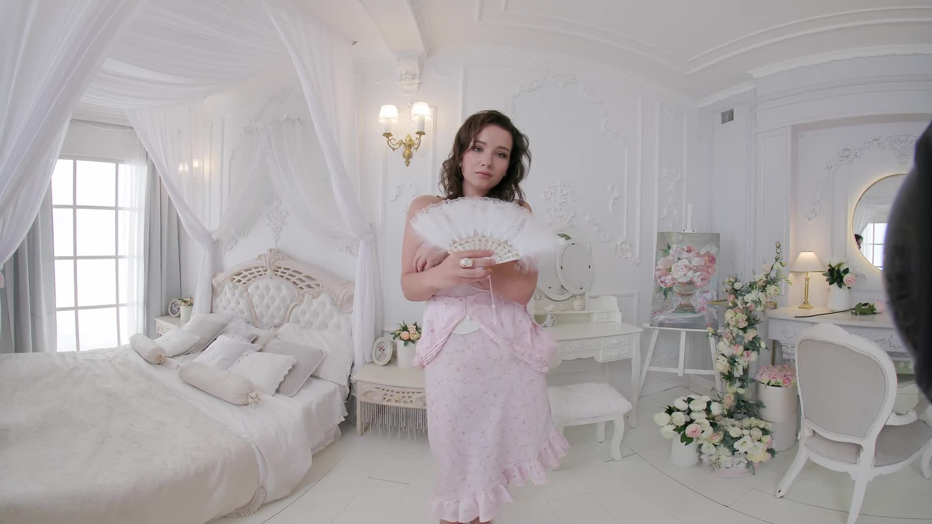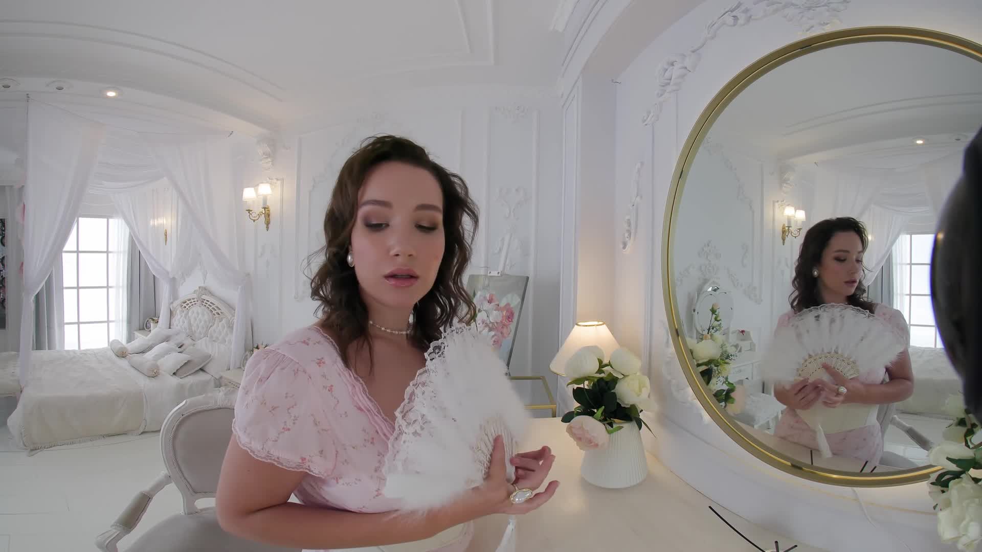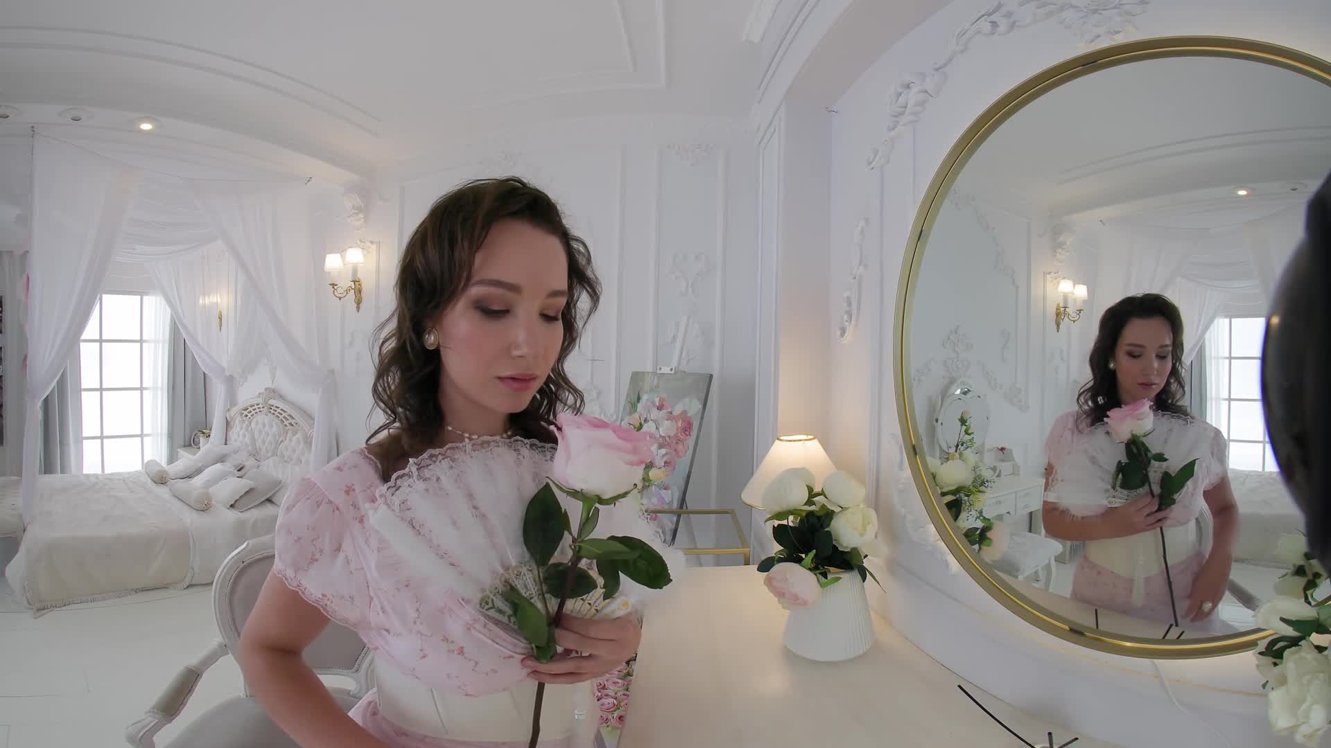 Like a Renaissance girl, Sophia plays with a rose in her boudoir.