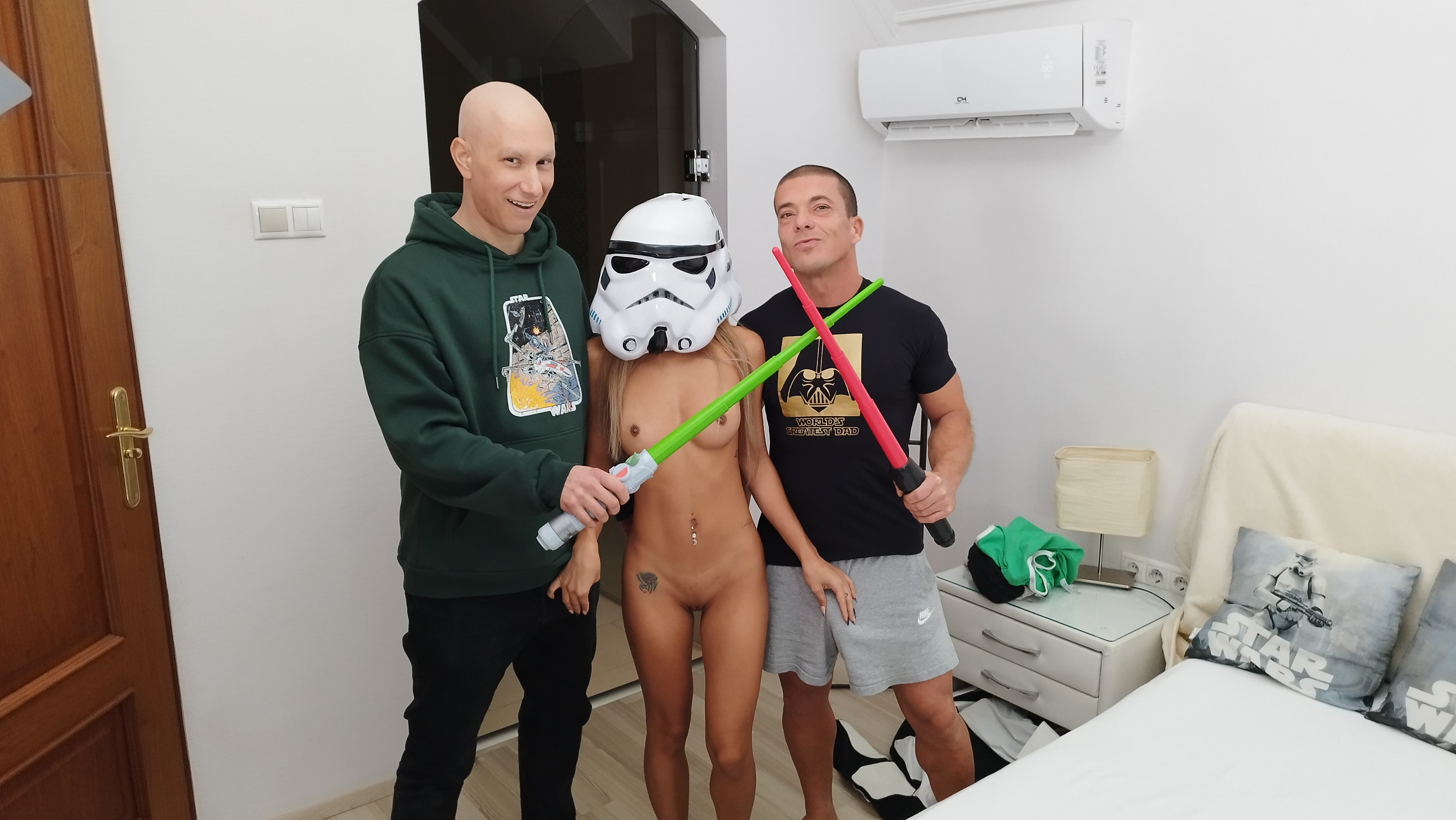 The third and final part of this epic virtual reality VR version of sexy little nympho Clara Trinity. Clara Trinity has accomplished her mission to make her Star Wars-loving stepfather, Matt Bird, and his best friend, Brad Knight, bang her box. The skinny blonde with a bubble butt was able to fool Brad and Matt as easily as Jar Jar Binks tricked the world into believing he was a clown when he was the Sith. Clara Trinity has received a back-to-back deep creampie in the first two sections of this taboo trilogy. Much like how Jabba the Hutt always wants more money Clara Trinity wants more cum. Clara Trinity calls over Emperor-looking Brad so she can feel the dark side, and the submissive girl gives him a rimming. The petite Asian rides the evil-looking Jedi and impresses him with her blowjob skills, drooling and gagging on his cock and then eating his ass. Clara Trinity shows she is skillful as General Grievous handling two light sabers when she takes on the big dicks of Brad and her stepdad at the same time. Matt cannot hold back and unleashes a load so big that Chew bacca would be shocked. Clara Trinity keeps eating ass until she makes Brad cum as well, and she licks up his sperm. Matt comments his stepdaughter could be the Sith, the way she manipulated him and his best friend as this torrid threesome concludes