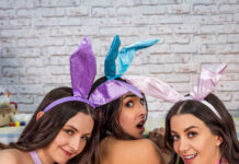 See how all the Easter magic happens and become the most famous rabbit in the world. You are the ultimate Egg Man and this is your busy season so Madison Wilde, Serena Hill and Natalie Brooks are all hard at work decorating eggs. Time is ticking and you don't want to be late for this very important date so you do what you can to motivate this trio of bunnies. When the most perfectly painted egg is broken, will this be the end? No! Madison, Natalie and Serena will do everything they can so they can all stay gainfully employed. Join them for a real break and cut them some slack as they attack your thick dick! Sit back as they share your stiff carrot with a shared blowjob then bend each of them over to fuck in rabbit style, er.. doggy style! Flip them around to screw in missionary then let them do all the work with some holiday cowgirl and more! You'll jizz all over their pretty faces and turn this workshop into a sticky mess one way and then the other. Happy Easter!