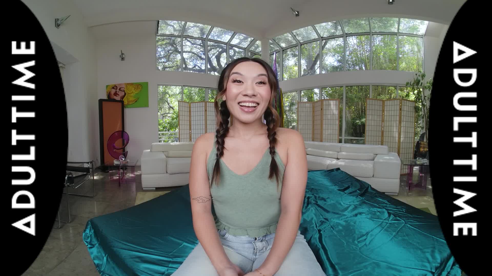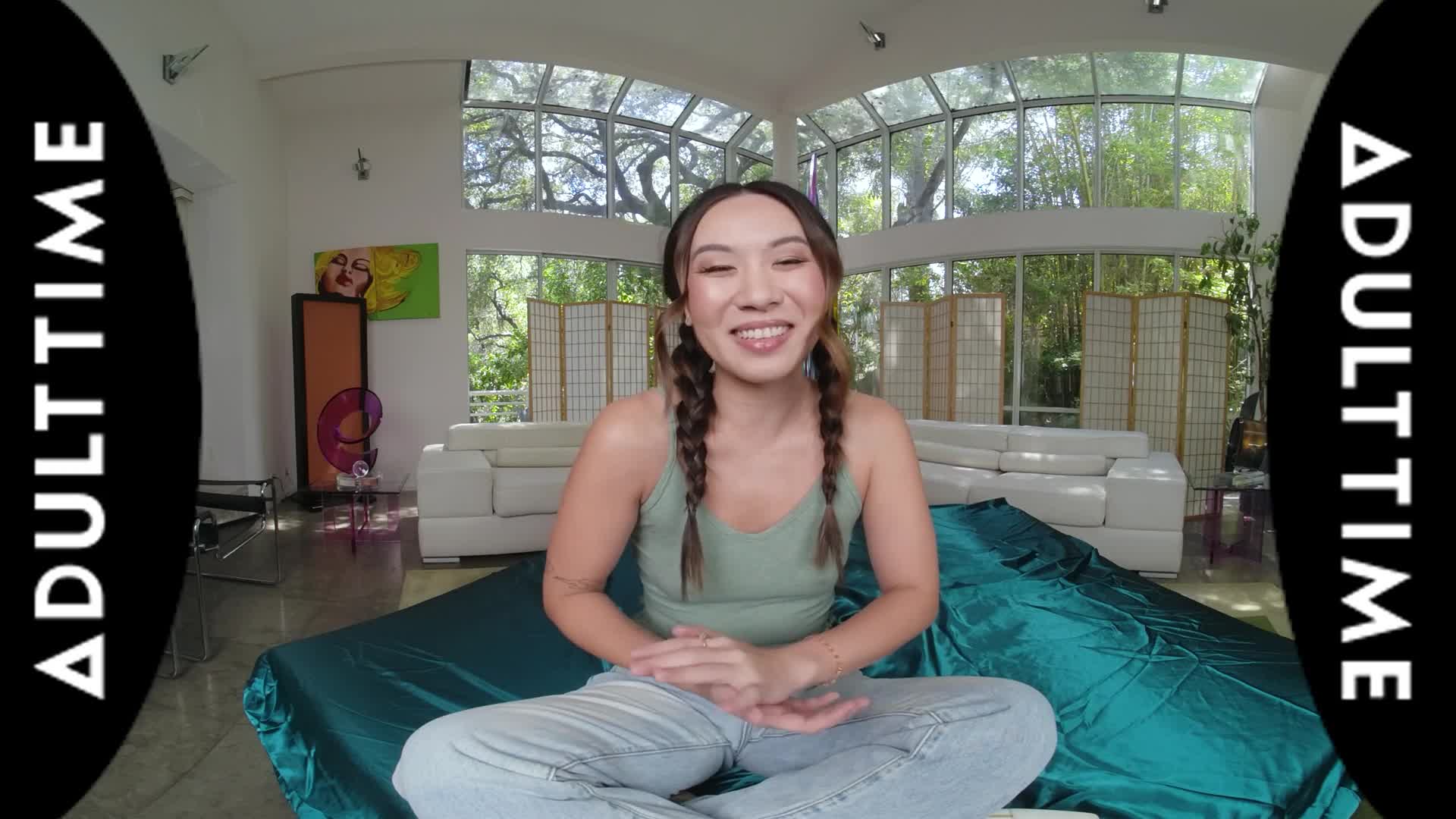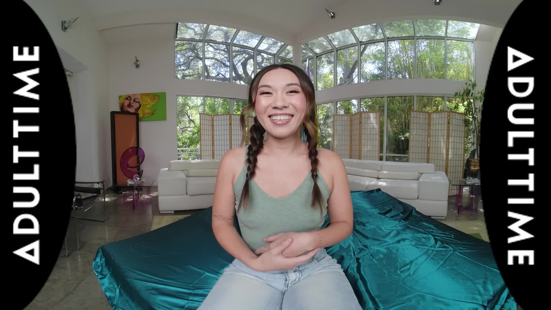 Kimmy Kimm is looking cute with her braids as she cheerfully settles in for an interview with Dante Colle. Right away, she starts with revealing three things that Dante might be surprised to learn about her: that she's from Georgia, that she doesn't drive, AND that she used to be a gymnast! The funny thing is is that Dante used to be a gymnast, too, so now it's time to see just how flexible both of them still are.
