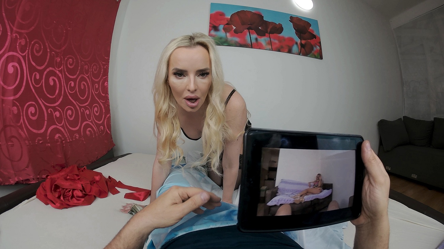 You are laying in bed, watching some videos of your favorite pornstar, Victoria Pure. Suddenly, Victoria appears on your bed, looking through a VR headset. Seems she’s found a way to join you in the VR world. After joining you to watch some clips of her previous sex romps, the blonde model starts getting aroused. Now she wants to shoot a new scene. Before you know it, she slips out of her bathrobe to reveal some sexy lingerie. Then she sucks and fucks you until you spurt your virtual-reality cum into her virtual-reality mouth.
