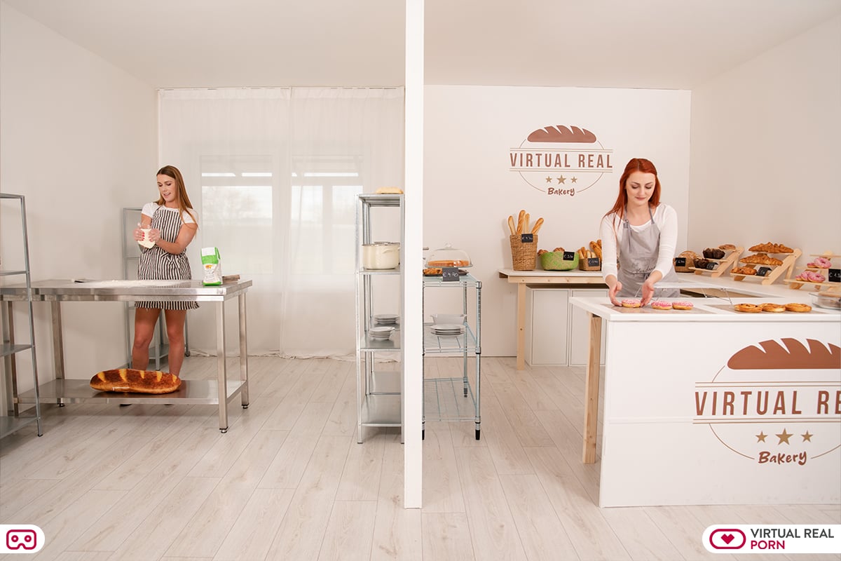 Katy Rose (POV) is working in the bakery, diligently organizing all the products. Meanwhile, in the kitchen, Alexis Crystal is preparing some bread dough. The heat is unbearable, and Alexis keeps wiping the sweat from her brow, clearly uncomfortable. Unable to stand it any longer, she takes off her top and continues working in just her apron. As she starts to touch herself, enjoying her private moment, Katy enters the room. She is surprised by the sight of Alexis’ exposed butt and her sensual movements as she leans over the table. Katy, mesmerized, begins to touch herself while watching Alexis. When Alexis realizes she’s being observed, a knowing look passes between them, and they decide to have sex on the table. Alexis kneels to lick Katy’s pussy while touching her nipples to make her wet. She takes one of Katy’s fingers and licks it very sensually to keep pinching her nipples. Then, Katy sits on Alexis’ face so she gives her more pleasure. And they change positions, because now it’s the turn of Katy to lick Alexis’ pussy. They want to feel pleasure at the same time so they do scissors and their pussies rub together. They masturbate each other until they come… But Alexis has to hurry up, because someone has entered the bakery!