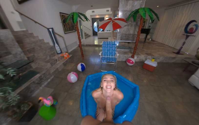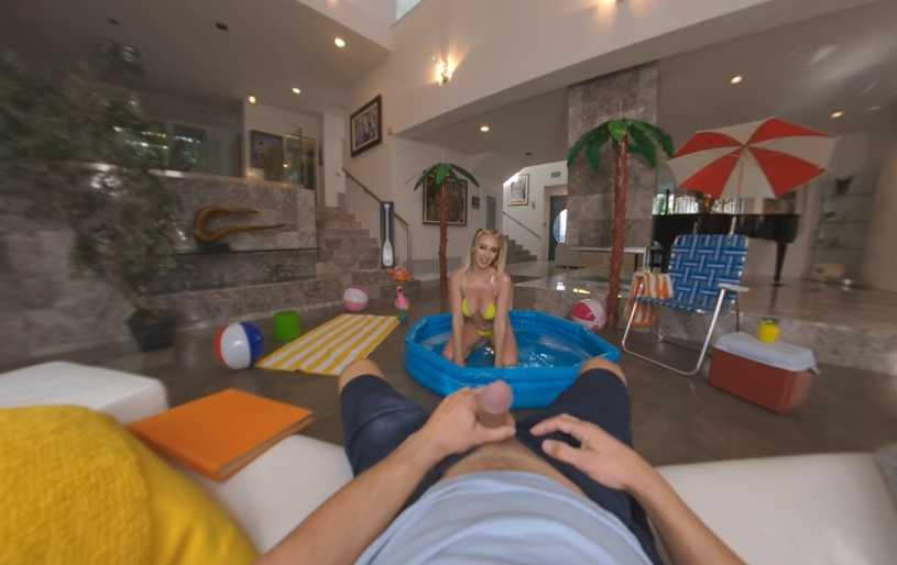 Despite being on vacation, you’re not in the mood to go to the beach, but that’s ok because your smokin’ hot girlfriend Kendra Sunderland will bring the beach to you! After wetting her bikini-clad body in a paddling pool, the sexy blonde gags on your cock before jerking you off between her big natural titties and then riding your cock to orgasm!