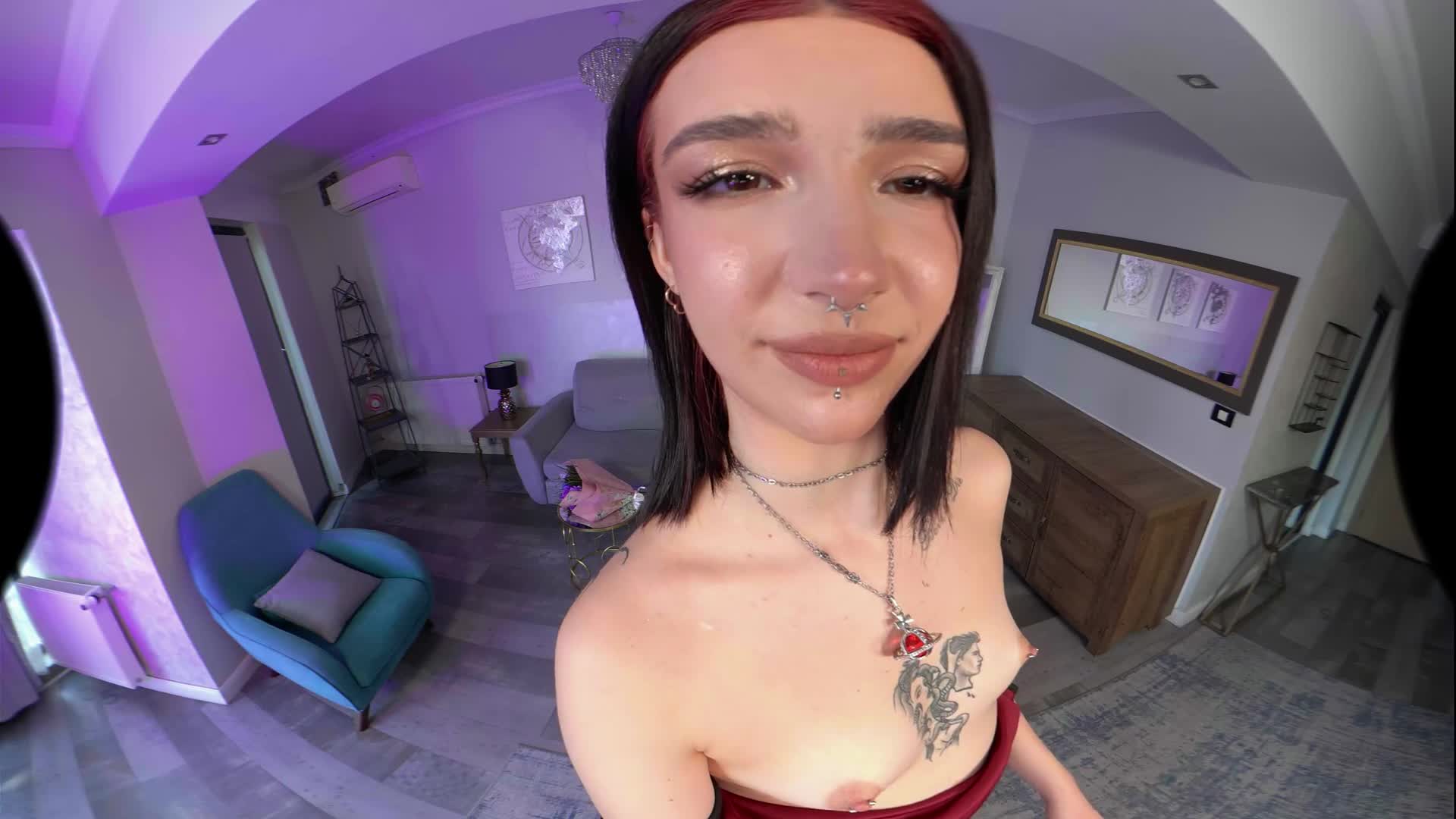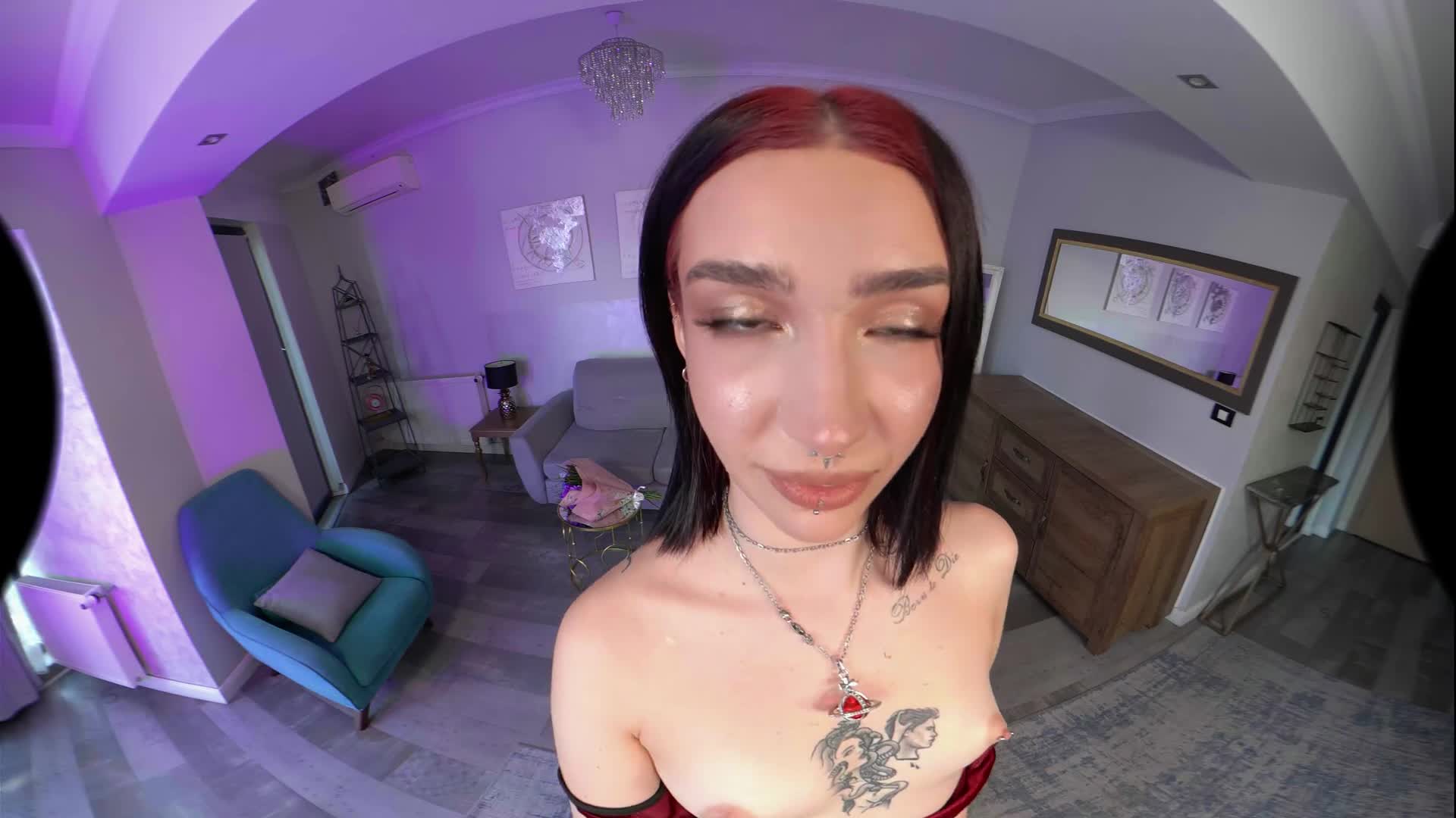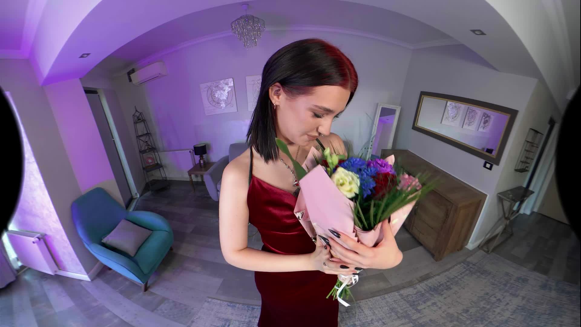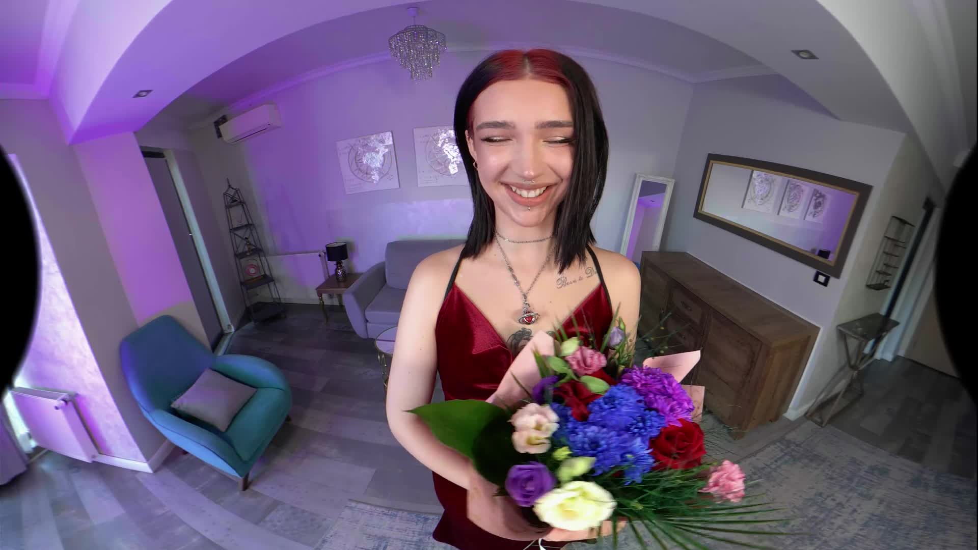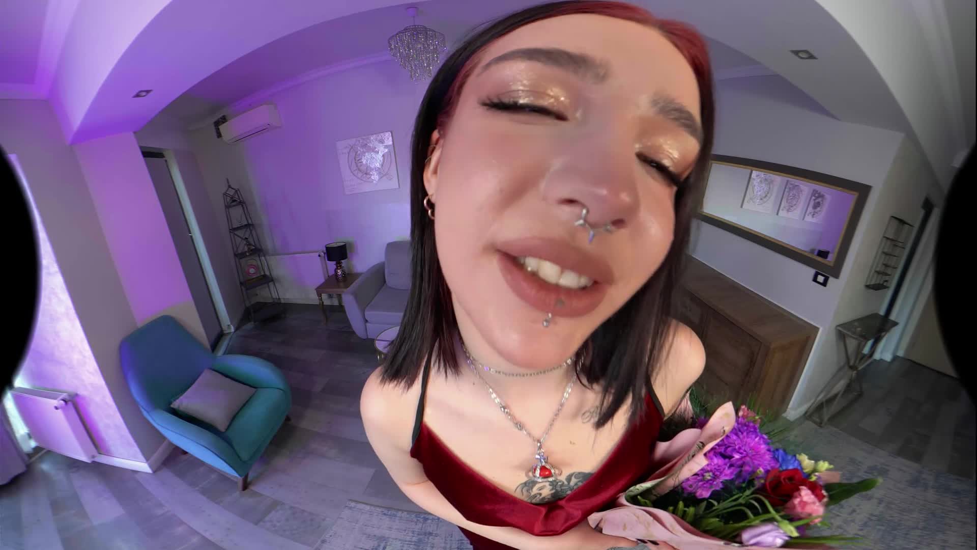 You brought Scarlett flowers to impress her. The moment was so touching for her that she actually started undressing. She is so sexy with those high heels and her beautiful face. A cute teen with neo-tribal tattoos that loves sucking cock. If you like the emo or goth vibe, you're in for a ride. She gets on her knees and starts sucking your cock after a handjob. After that, she goes to a chair and asks to be fucked in doggystyle and missionary on the table. Just let her fuck you now, as she actually wants to ride your cock in cowgirl and reverse, but don't twitch when she starts licking your balls as you cum hard.